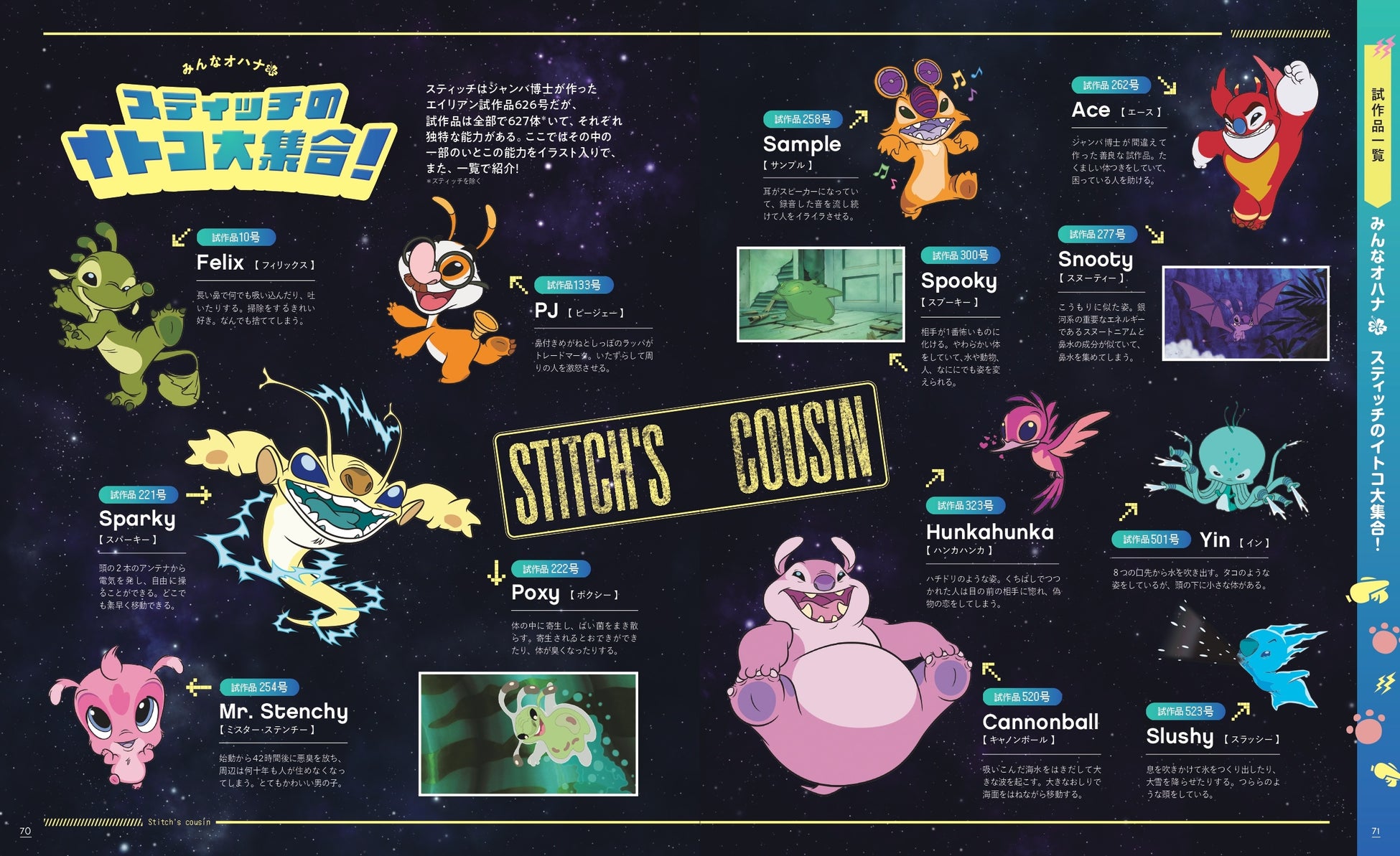 スティッチを語る上では欠かせない、声優・山寺宏一さんのスティッチ愛が伝わるメッセージを掲載。ほかにも、スティッチ・クロニクル、スティッチの627体のイトコ一覧、エンジェル&リロイの紹介など、豊富なイラストと映画・アニメシーン画像を織り交ぜた特集を収録しています。