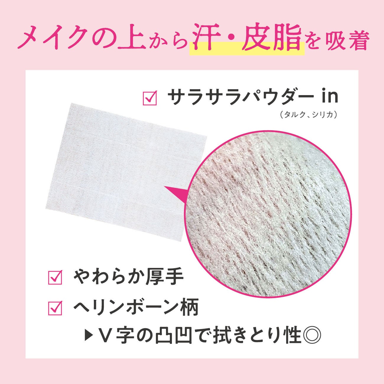 すっぴんはもちろん、メイクの上からもやさしく押さえて汗・皮脂サラっとスッキリ!
