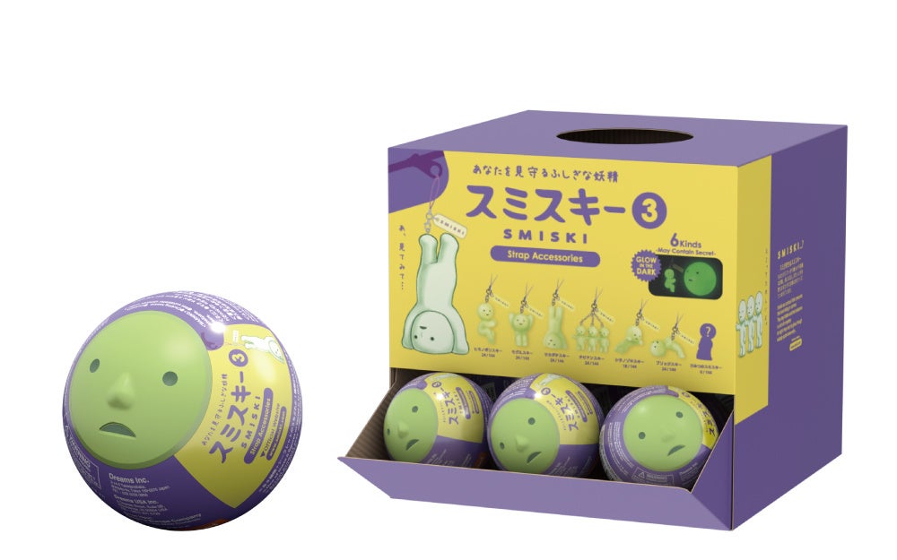 10周年を迎えた、あなたを見守るスミが好きな妖精「スミスキー」より、『SMISKI Strap Accessories Series 3(スミスキー ストラップ アクセサリー シリーズ 3)』が新登場。ミニサイズのストラップになったスミスキーが、ひっそりとあなたを見守ります。スミスキーはもちろん、カプセルにも光を吸収し、暗くなると発光する蓄光素材を使用しているため、暗闇ではぽわっと光ります。全6種類+シークレット 1種類のラインナップ。