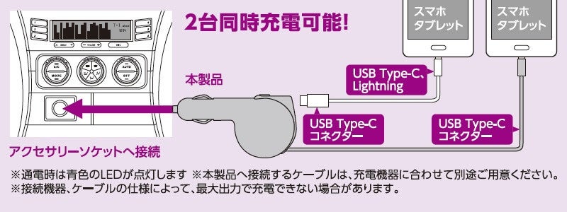 車内で2台の端末を気軽に充電できる本製品をぜひご活用ください。