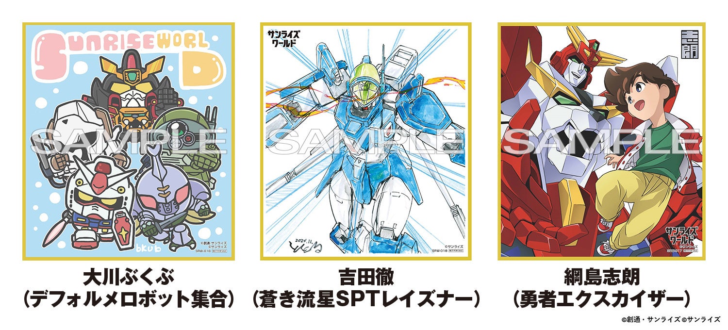 また、4月18日(金)より横井孝⼆が描き下ろしたキービジュアルイラストを使⽤した新商品が登場、「サンライズワールド」全5店舗 (SENDAI、TOKYO、YOKOHAMA、HAKATA、KYOTO)にて販売します。各店舗では物販購⼊特典として 3,000 円(税込)ご購⼊ごとにクリエイター描き下ろし複製ミニ⾊紙を1枚プレゼント。「サンライズワールドSENDAI」では、『デフォルメロボット集合』、『蒼き流星SPTレイズナー』、『勇者エクスカイザー』の 3 種からランダムでプレゼントします。