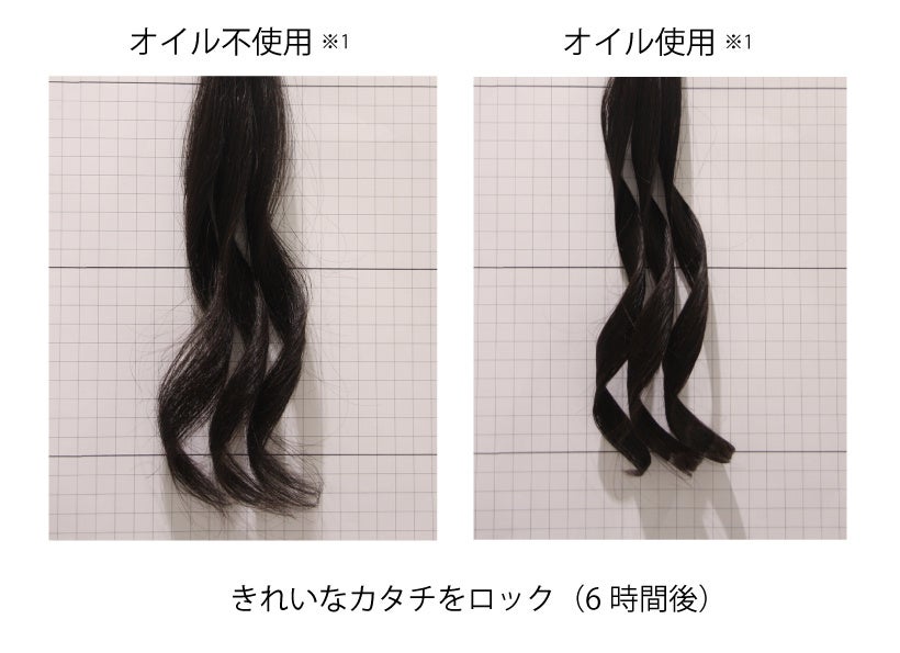 ※1 ReFa LOCK OILを1プッシュ塗布した毛束と、塗布していない毛束に対して180℃に設定したReFa BEAUTECH CURL IRONを使用。1.5回転巻き付け、10秒間加熱した後アイロンを外し放置。温度25±1℃、湿度65±5%の環境で6時間経過後、それぞれの毛束を撮影した。