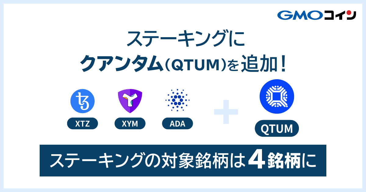 なお今回の追加により、ステーキングサービスでの取扱銘柄は、テゾス(XTZ)、シンボル(XYM)、カルダノ(ADA)、クアンタム(QTUM)の4銘柄となります。
