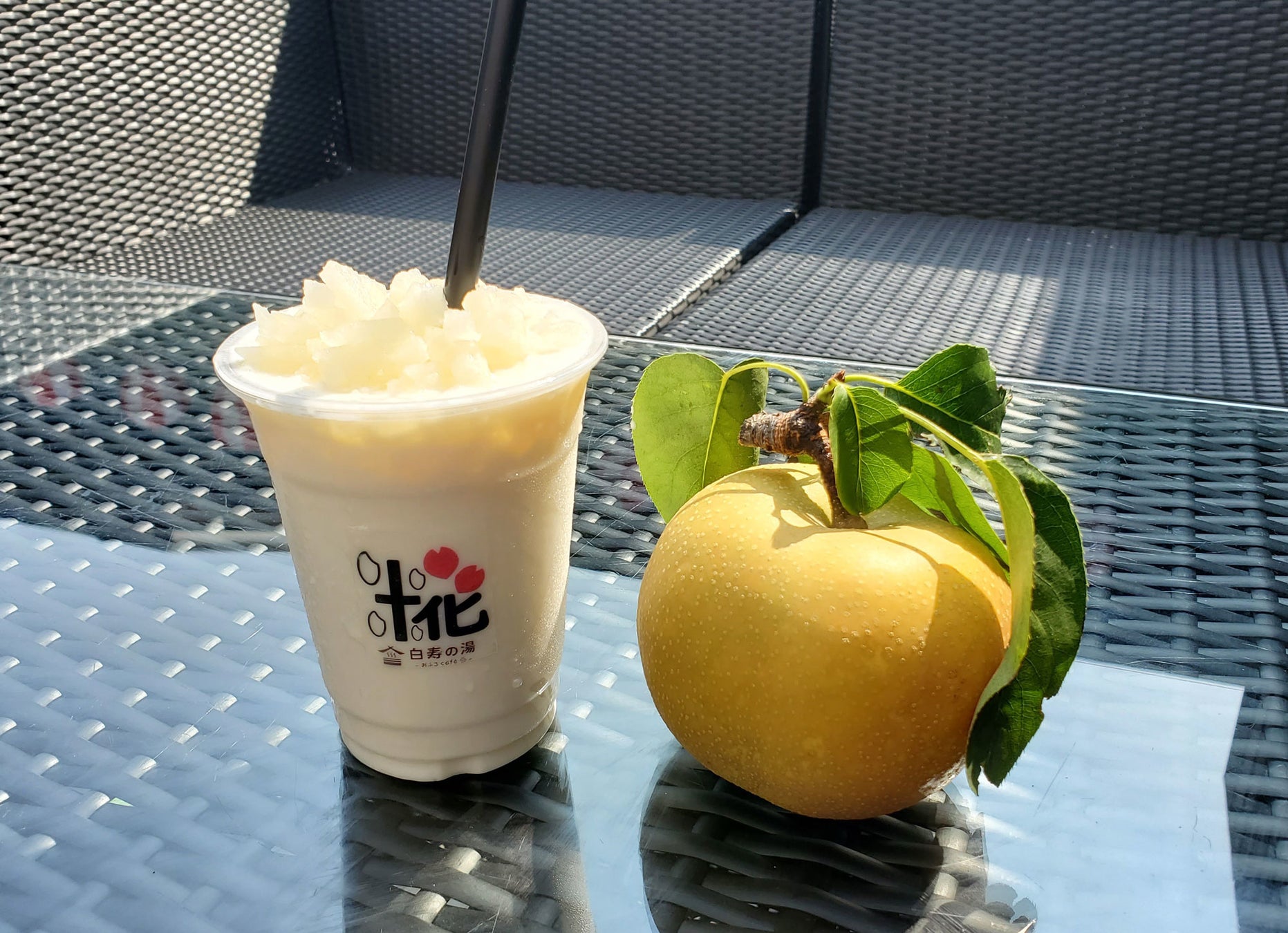 「梨の葉風呂」に合わせて、売店では児玉郡の梨の販売を実施、食事処 俵やでは夏季限定の「梨甘酒しぇいく」を販売します。甘酒の甘さに、みずみずしい梨の食感と甘味をプラスした、暑い夏にピッタリの栄養満点のデザートドリンクです。