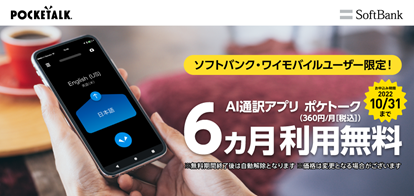 ソフトバンクやワイモバイルユーザーを対象に、2022年4月25日(月)~10月31日(月)の期間にAI通訳アプリ「ポケトーク」(iOS版/ Android版)の利用を開始すると、利用料が利用開始日から6ヵ月間無料となるキャンペーンを実施いたします。