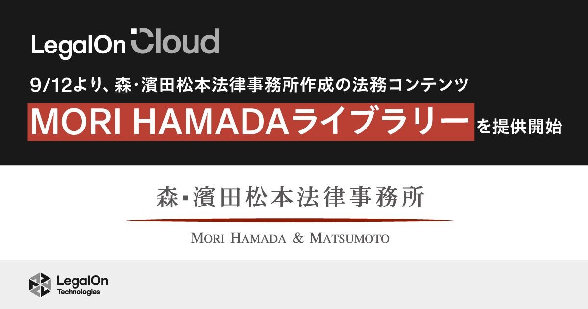 株式会社LegalOn Technologies(本社:東京都渋谷区 代表取締役 執行役員・CEO:角田望、以下LegalOn Technologies)が提供する、法務業務全体を包括的に支援するAI法務プラットフォーム「LegalOn Cloud」は、9月12日(木)より森・濱田松本法律事務所が作成する法務コンテンツを搭載した「MORI HAMADAライブラリー」(https://www.legalon-cloud.com/function/morihamada-library )の提供を開始いたします。