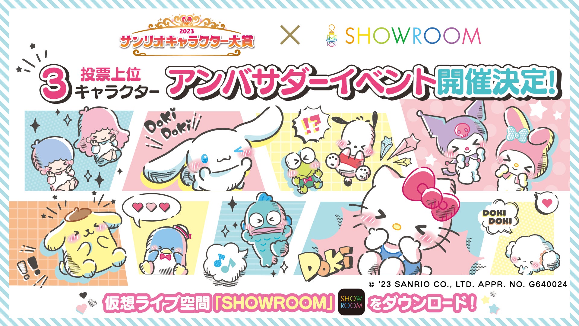 ライブ配信プラットフォーム「SHOWROOM」にて、今年も「2023年サンリオキャラクター大賞」上位3キャラクターのSHOWROOMアンバサダーを決める特別なイベントを開催します。様々なジャンルのパフォーマーが集うSHOWROOMから、どんなライバーがアンバサダーになるのかご注目ください。※詳細は2023年7月にSHOWROOMにて公開予定です。※イベント期間は2023年7月〜9月を予定しています。