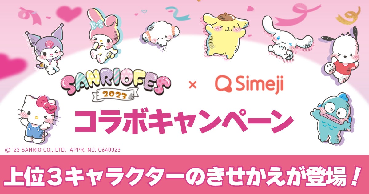 キーボードアプリ「Simeji」内にて、2023年6月11日(日)から7月11日(火)までの期間限定で、「2023年サンリオキャラクター大賞」の上位3キャラクター(シナモロール、ポムポムプリン、クロミ)のきせかえデザインを無料配布します。抽選でオリジナルグッズがもらえるキャンペーンも開催中です。