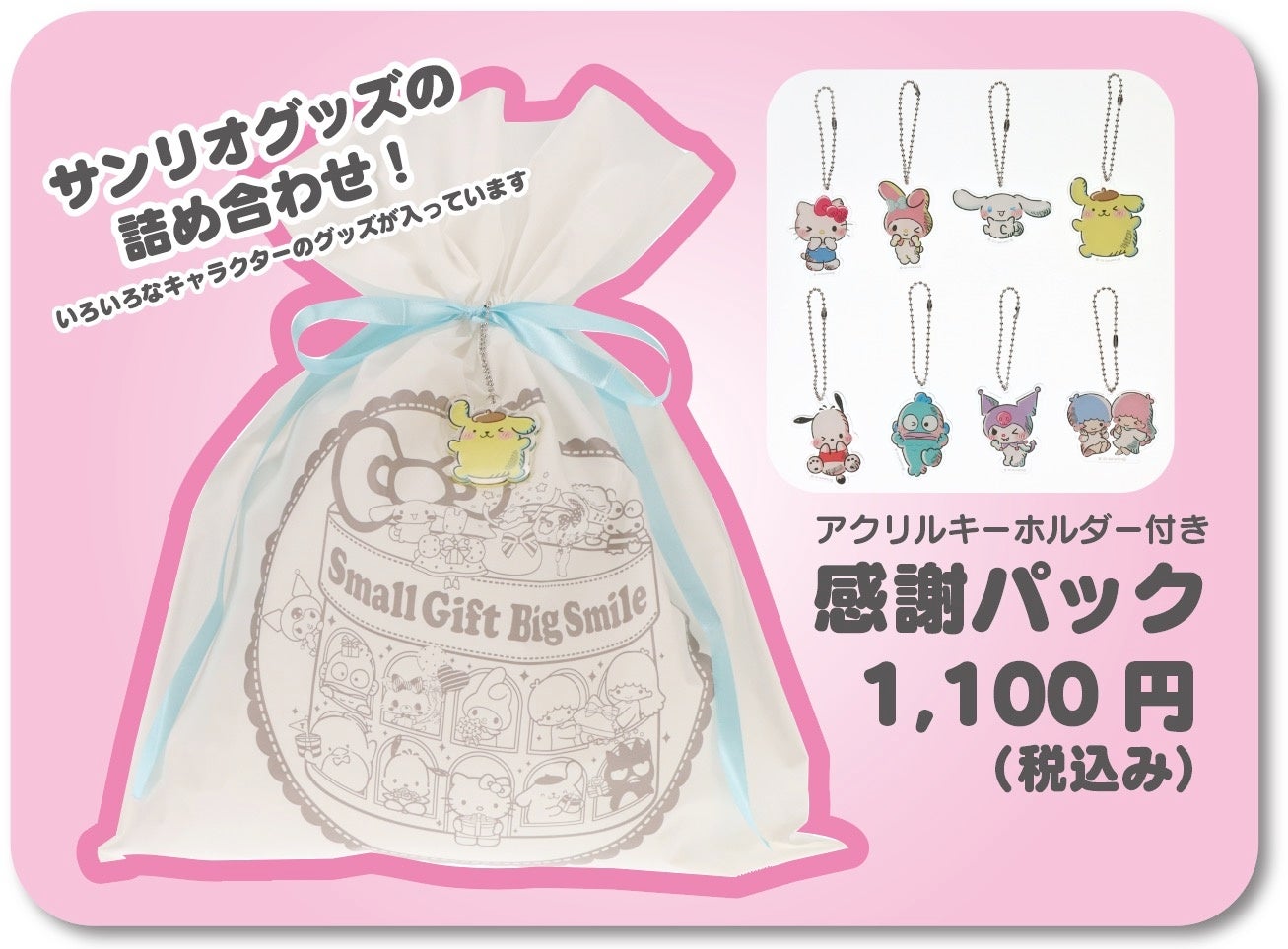 アクリルキーホルダーのキャラクターは、ハローキティ、マイメロディ、シナモロール、ポムポムプリン、ポチャッコ、ハンギョドン、クロミ、リトルツインスターズの計8種類です。感謝パックの中身は、いろいろなキャラクターのアイテムが混ざっています。