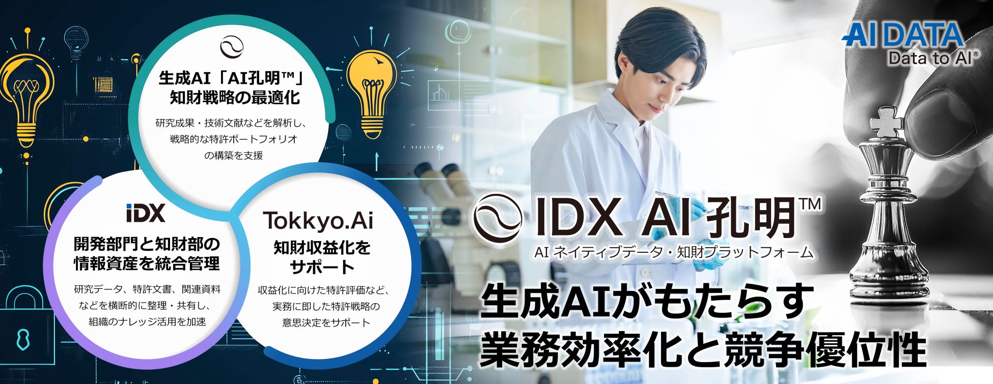 企業データとAIの利活用カンパニー、AIデータ株式会社(本社:東京都港区、代表取締役社長 佐々木隆仁、以下AIデータ社)は、研究開発(R&D)部門および知的財産(IP)管理部門向けに、生成AIを活用した次世代知財戦略プラットフォーム「AI孔明™」 の提供を開始しました。