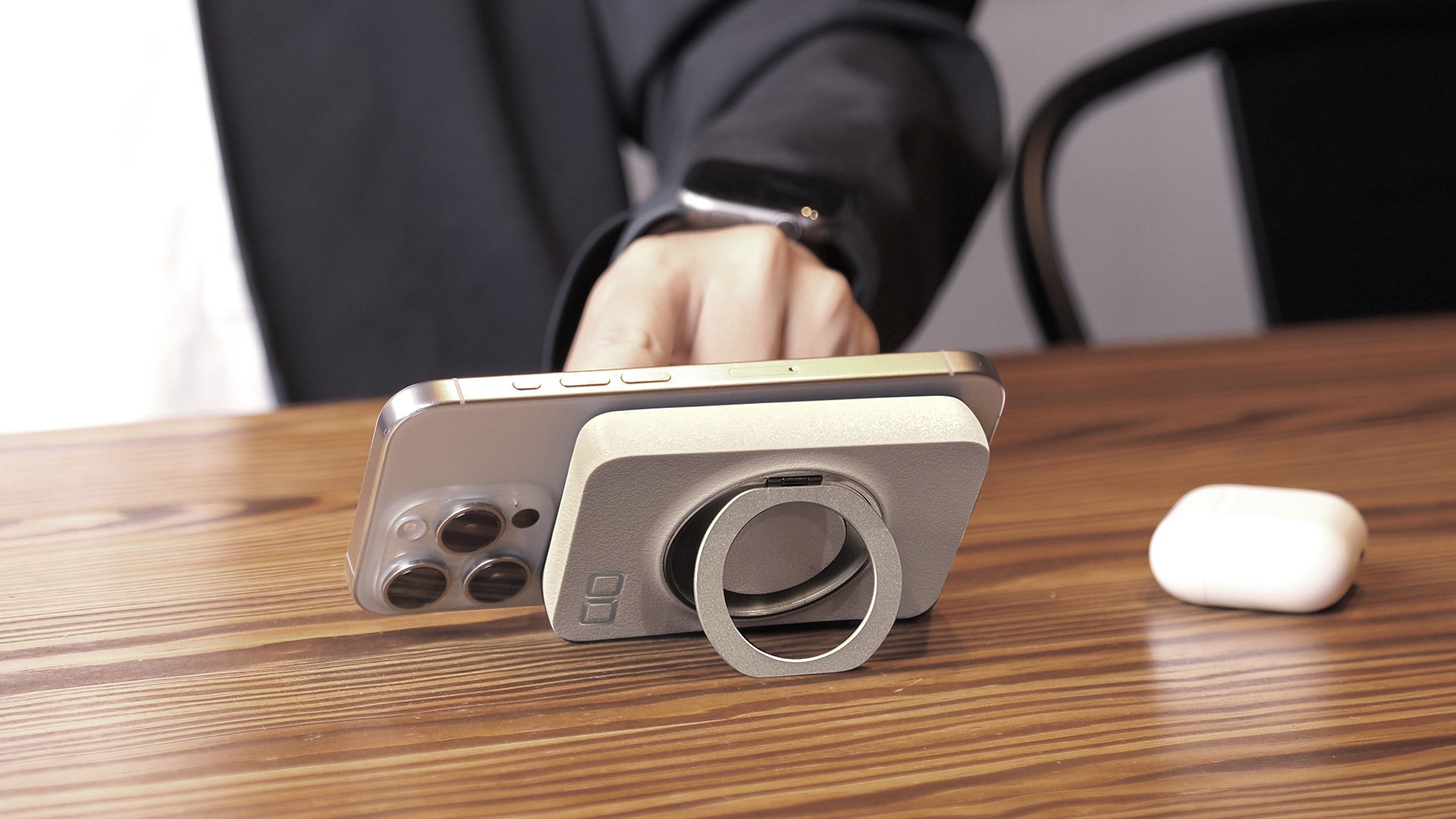 MagSafe対応のiPhone(12シリーズ以降)なら強力マグネットでピタッと吸着。そのままポンとカバンに入れて充電できます。
