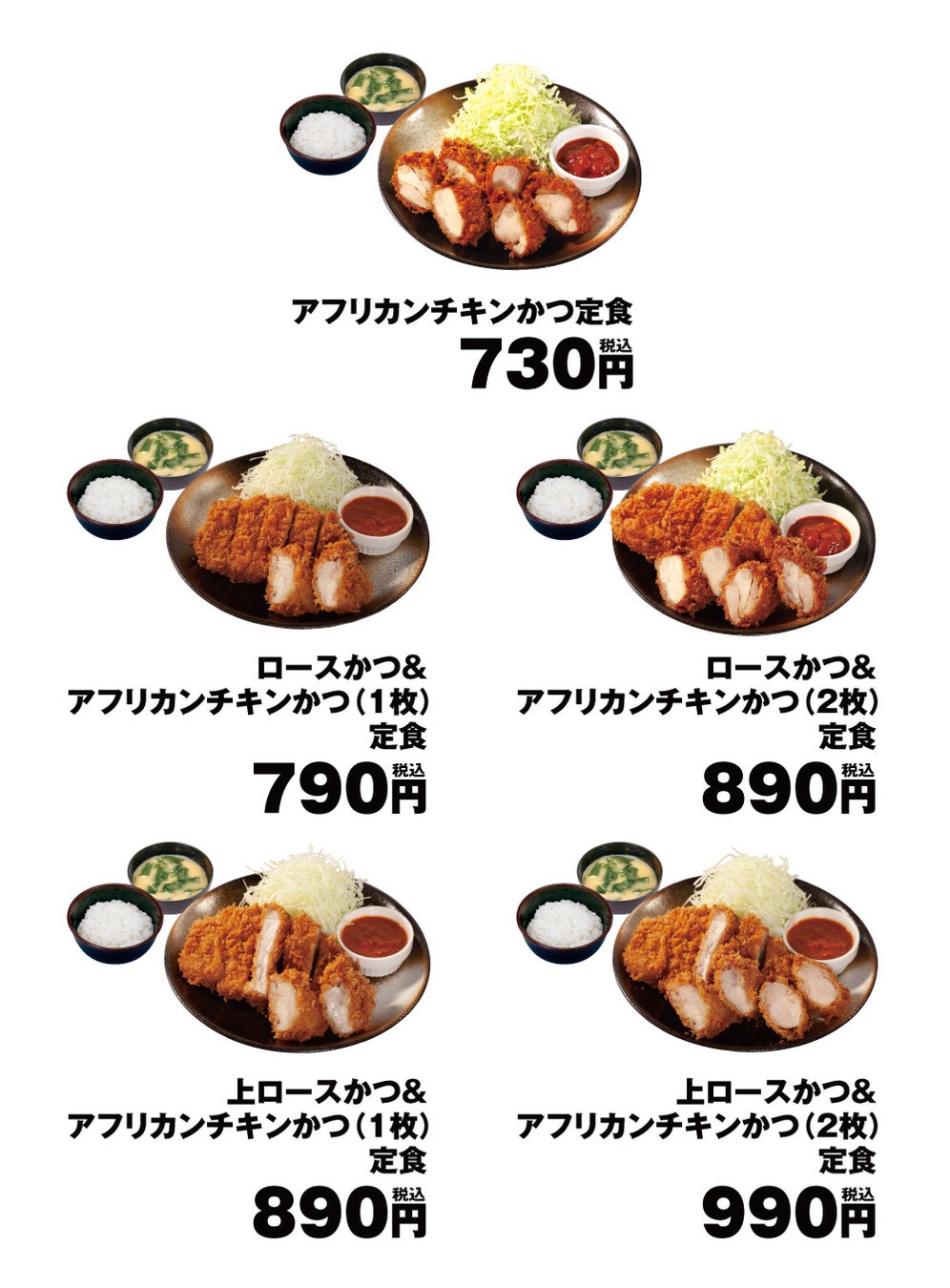 商品名 アフリカンチキンかつ定食 730円 ロースかつ&アフリカンチキンかつ(1枚)定食 790円 ロースかつ&アフリカンチキンかつ(2枚)定食 890円 上ロースかつ&アフリカンチキンかつ(1枚)定食 890円 上ロースかつ&アフリカンチキンかつ(2枚)定食 990円 ※全て税込価格です。また、店内・お持ち帰りの税込価格は同一です。 ※お持ち帰りいただけます。お持ち帰りのみそ汁は、別途60円でお買い求めいただけます。 ※株主優待券は上記全てのメニューにご使用いただけます。 発売日 2023年7月12日(水)午後3時~ 対象店舗 一部店舗を除く全国の松のや 176店舗 下記URLをご参照ください。 ※松屋併設店・高速PA店舗・沖縄店舗を除く |
