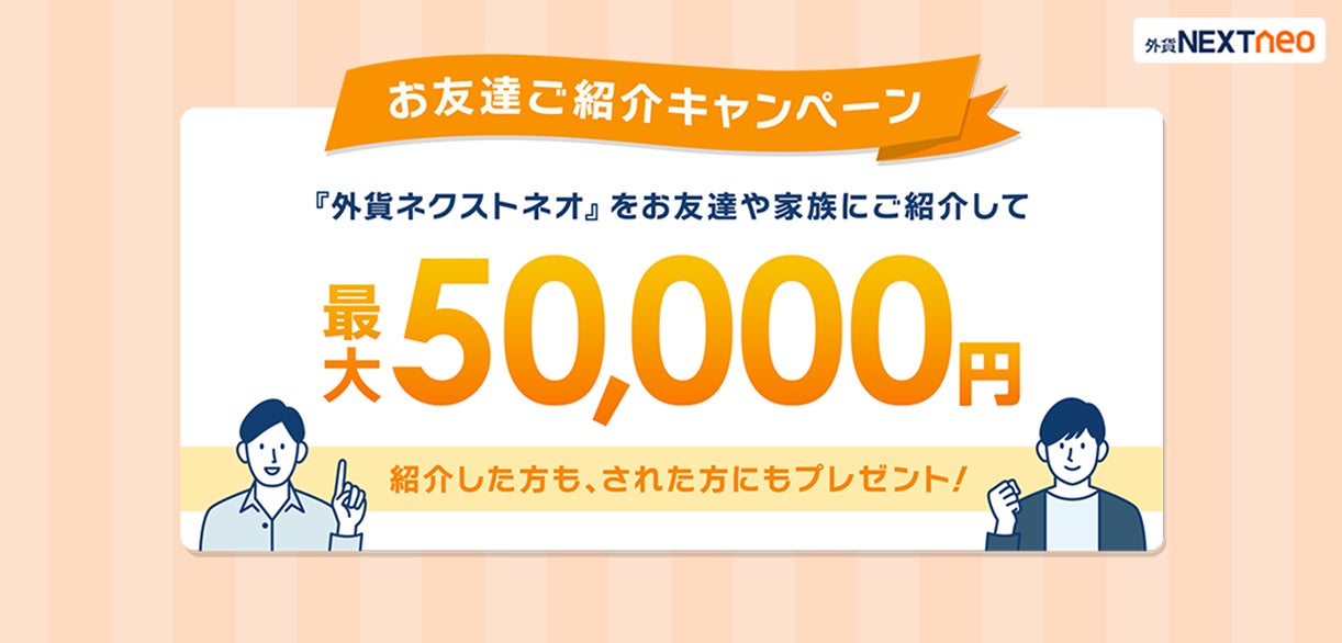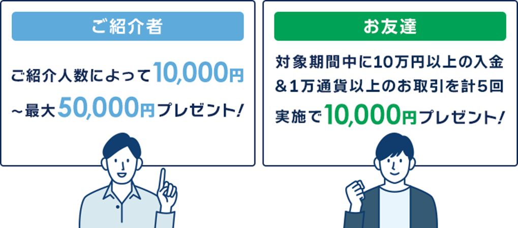 すでに『外貨ネクストネオ』を開設しているお客様(「ご紹介者様」)が、『外貨ネクストネオ』に興味をお持ちの方(「お友達」)を紹介していただき、後日その「お友達」が条件(『外貨ネクストネオ』にて10万円以上の入金(※1)、および1万通貨以上の新規取引を5回以上)を満たされた場合には、「ご紹介者様」と「お友達」の双方にもれなく現金10,000円をプレゼントいたします。