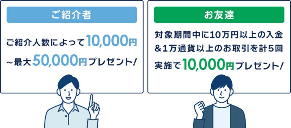 うち「ご紹介者様」については、本キャンペーンの適用対象となる「お友達」の上限を5名様までとし、そのすべてが条件を満たした場合には合計50,000円を獲得できます。キャンペーンの詳細については下記をご覧ください。