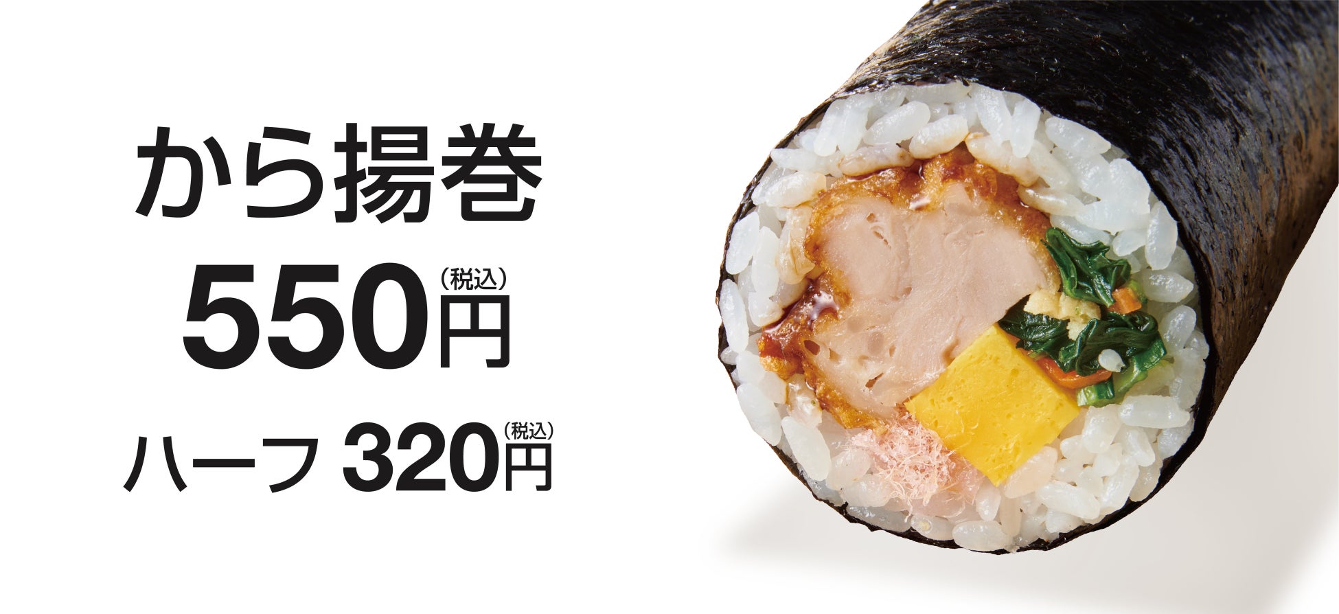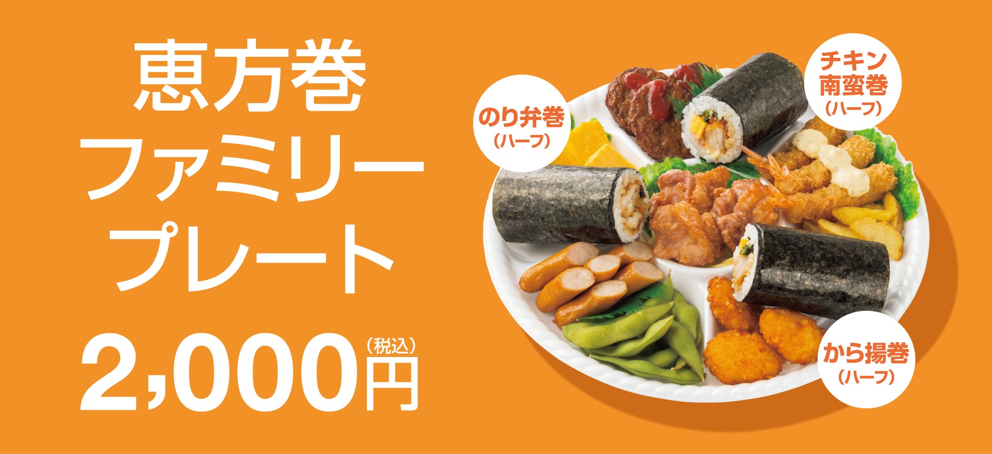 人気の弁当メニューを恵方巻にした「ほっともっと」の恵方巻は、『のり弁当』のいつもの美味しさをそのまま巻いた『のり弁巻』450円、から揚・だし巻玉子・桜でんぶ等を巻いた食べ応え抜群の『から揚巻』550円、甘酸っぱいチキン南蛮と具だくさんのタルタルソースがたまらない『チキン南蛮巻』550円の3種が登場します。また、ハーフサイズの恵方巻や、食べ比べセット、豚汁などのサイドメニューを合わせたセットなど豊富なラインナップをご用意しました。また、事前予約限定でハーフサイズの恵方巻3種類に加え、から揚、プチハンバーグ、エビフライなど人気のおかずを詰め合わせた恵方巻ファミリープレートも販売します。