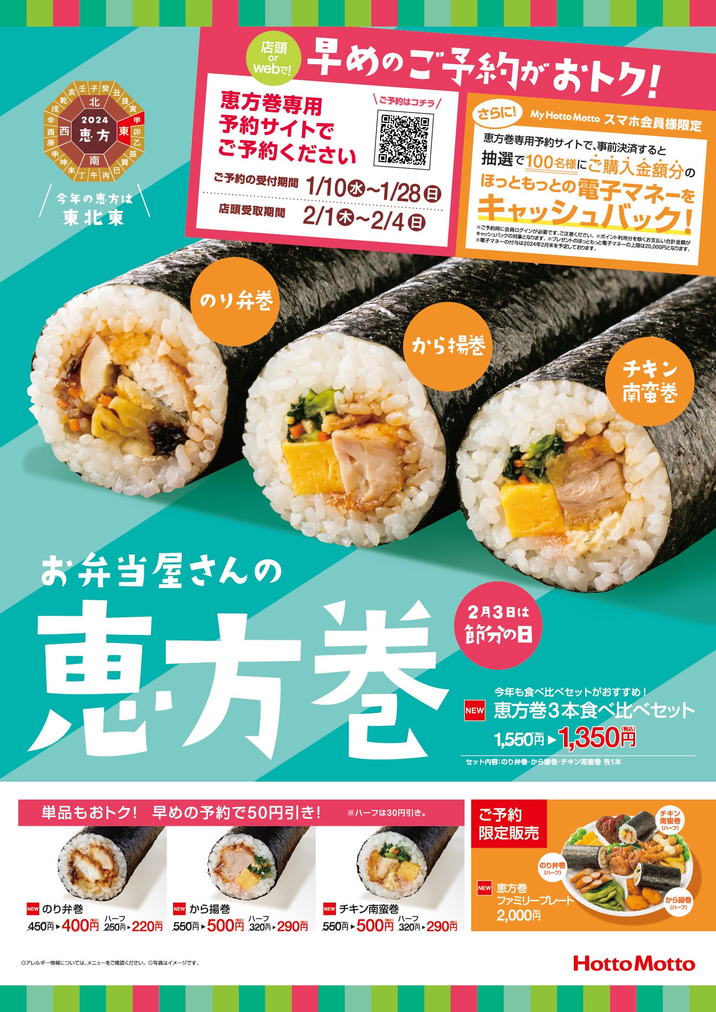 1月10日(水)より28日(日)の期間中に、店頭や恵方巻専用予約サイトよりご予約いただくと、恵方巻は50円引き(ハーフは30円引き)、セットは最大280円引きでご購入いただけます。また予約期間中、My Hotto Mottoスマホ会員様限定で、恵方巻専用予約サイトよりご注文かつ事前決済をご利用のお客様の中から抽選で100名様に、ご購入金額分のほっともっとの電子マネーをキャッシュバックいたします。※1