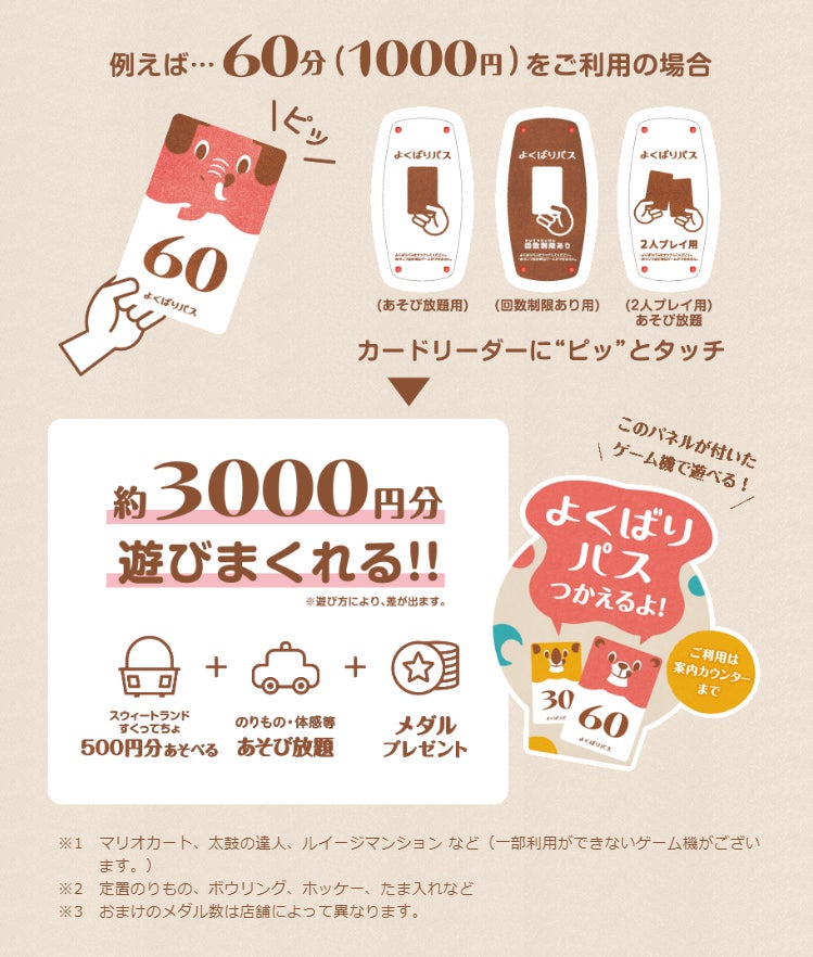 対象機種によっては「よくばりパス」1枚で2人プレイも可能で、ご家族やお友達と一緒に使えばますますオトクに遊べます。