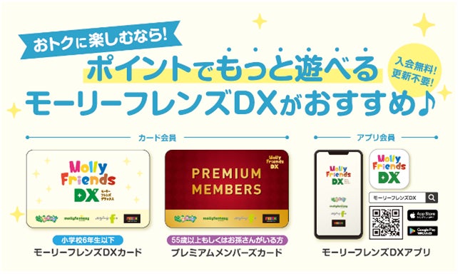 「モーリーフレンズDX」は、スマートフォンをお持ちの方対象の「モーリーフレンズDX」アプリと、小学校6年生以下のお子さまが対象の「モーリーフレンズDXカード」、55歳以上もしくはお孫さんがいる方が対象の「プレミアムメンバーズカード」からなる、アミューズメント施設「モーリーファンタジー」「PALO」の会員制サービスです。