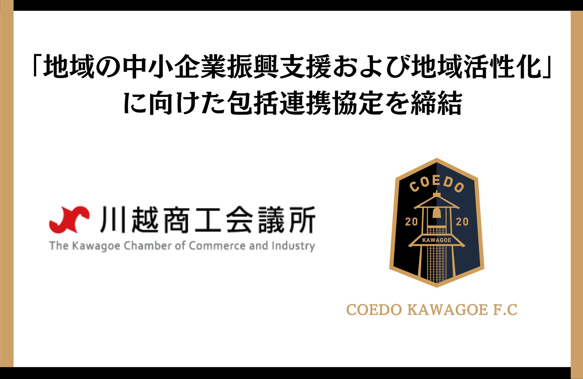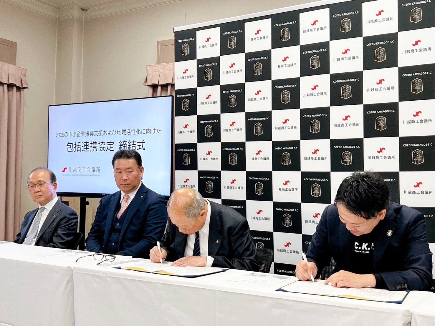 COEDO KAWAGOE F.Cを運営するCOEDO KAWAGOE F.C株式会社(埼玉県川越市、代表取締役 有田和生)は、地域の経済団体であり、川越市の企業をを中心に4,000企業以上が所属する川越商工会議所(埼玉県川越市、会頭 原敏成)との包括連携に係る協定を締結することに合意し、4月4日(木)に締結式を行いました。