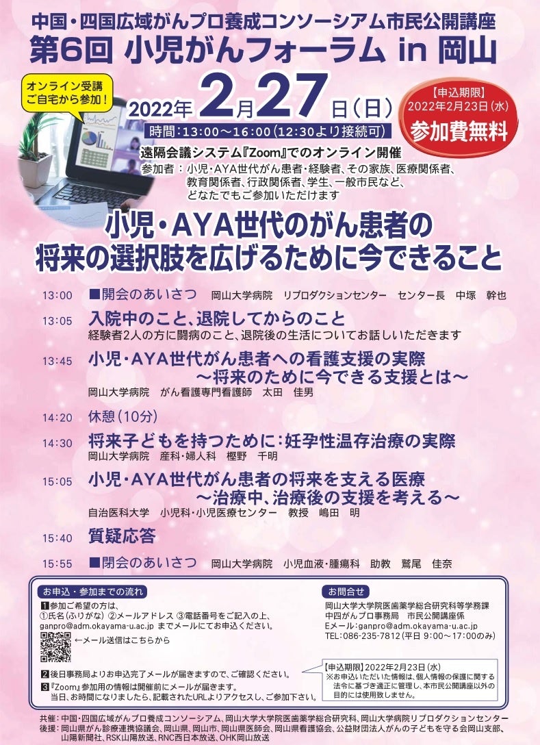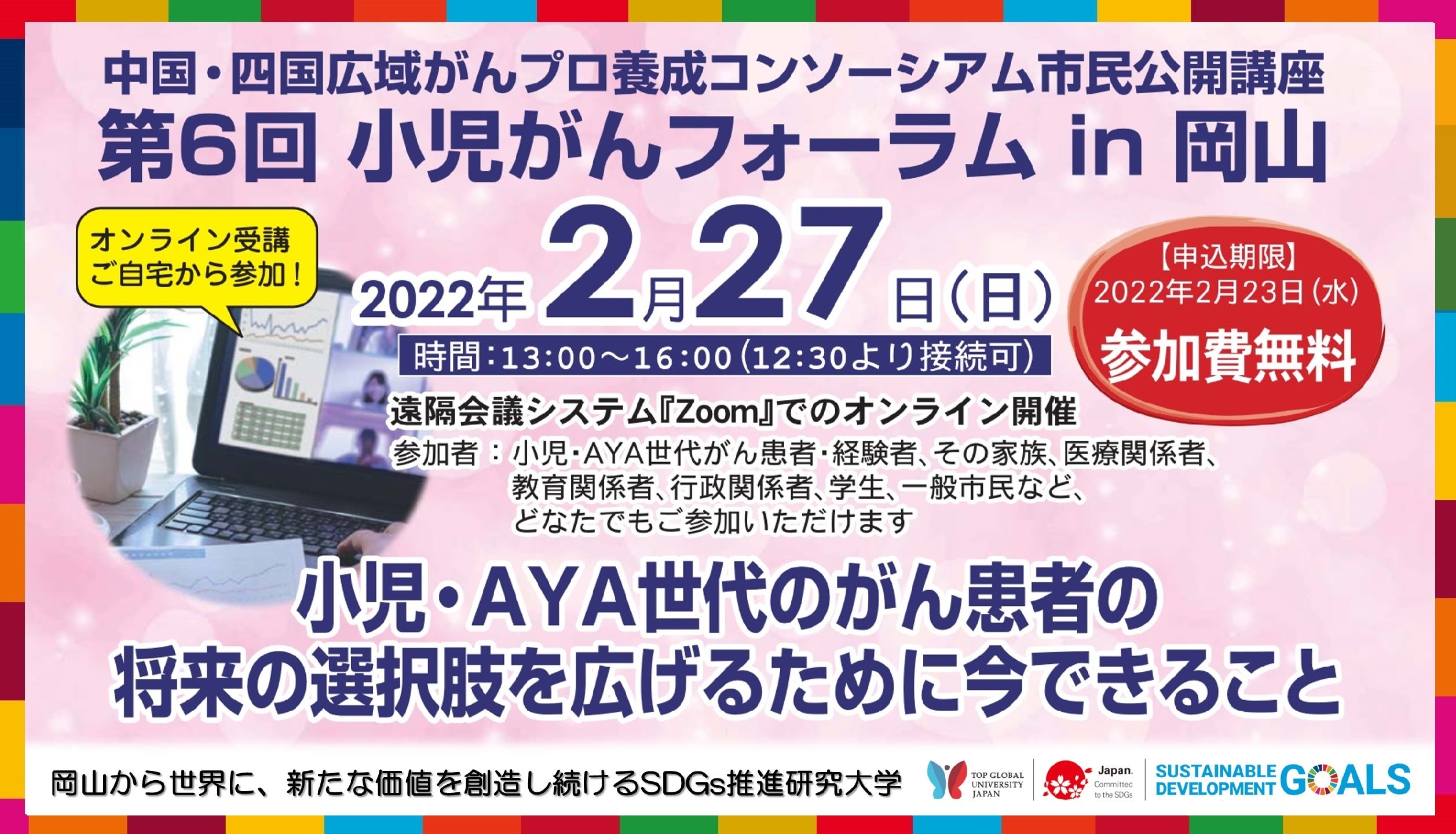 【岡山大学】「中国・四国広域がんプロ養成コンソーシアム」市民公開講座 第6回 小児がんフォーラム in 岡山 「小児・AYA世代のがん患者の将来の選択肢を広げるために今できること」