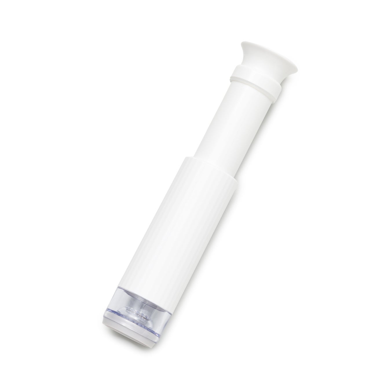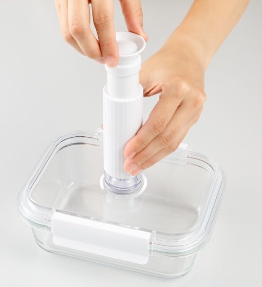別売の真空手動吸引ポンプを、ふたの弁に押し当てて吸引すると、保存容器の内部が真空状態となります。(※370mlサイズの場合、吸引回数5‐8回目安)
