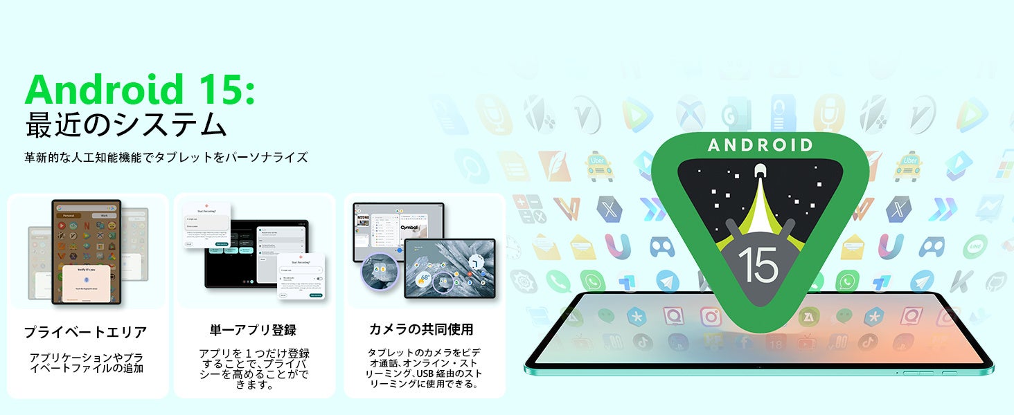 Android 15はタブレットの応答性と直感性を高め、シ一ムレスな日常使用を実現します。プライベ一トスペ一スのようなプライバシ一機能は個人デ一タを保護し、 Teclastのカスタム最適化は豊富なカスタマイズオプションを提供し、あなたのニ一ズに合わせてエクスペリエンスを調整します。