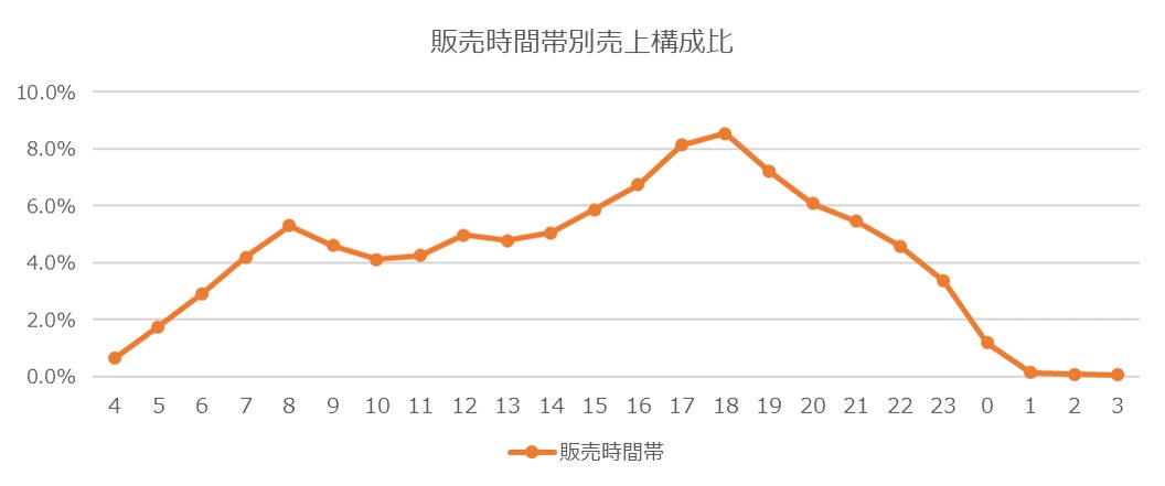 エキナカという場所・品揃えしている商品の特徴からも、プラスアキュアは習慣利用者が多い自販機の一つです。販売時間帯は、通勤時間帯と17-19時頃の帰宅時間帯が最も高いです。購入者属性は、全体の87%が、30代から50代の方々です。また、人気の商品カテゴリーは乳酸菌飲料で、全体の売上の60%を占めています。