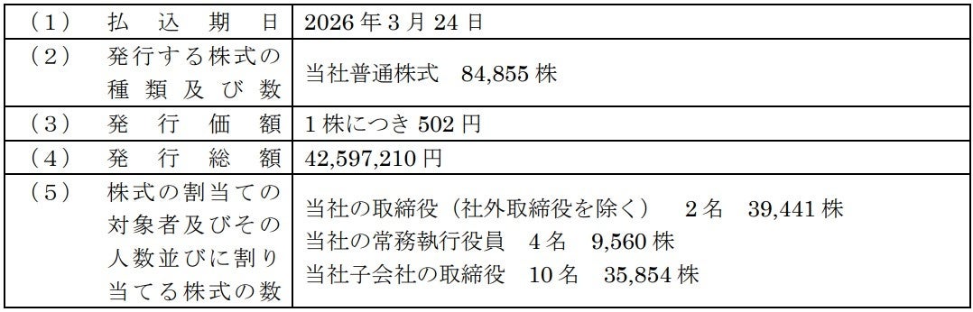 アステナホールディングス株式会社(本社:東京都中央区、代表取締役社長:瀬戸口 智、証券コード:8095)は、2026年2月26日開催の取締役会において、下記のとおり、新株式の発行(以下「本新株式発行」又は「発行」といいます。)を行うことについて決議いたしましたので、お知らせいたします。
