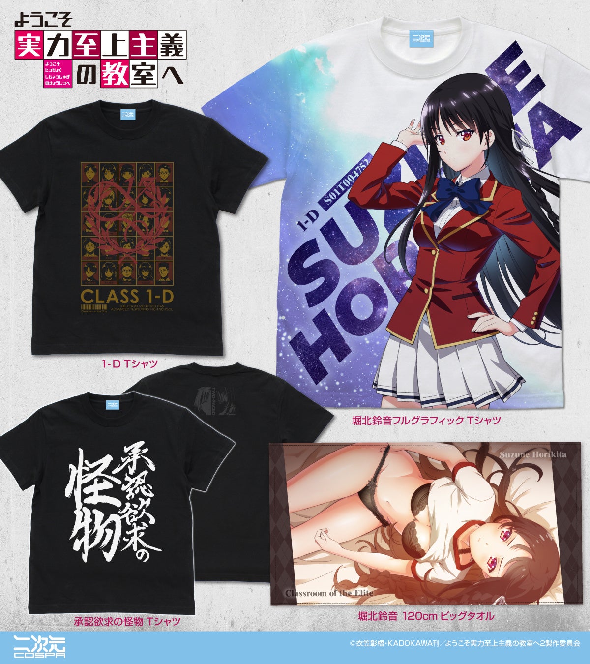 「綾小路清隆」「軽井沢恵」「堀北鈴音」「坂柳有栖」のつままれ、「1-D」「承認欲求の怪物」Tシャツ、「堀北鈴音」のフルグラフィックTシャツ、120cmビッグタオルが二次元コスパから登場。