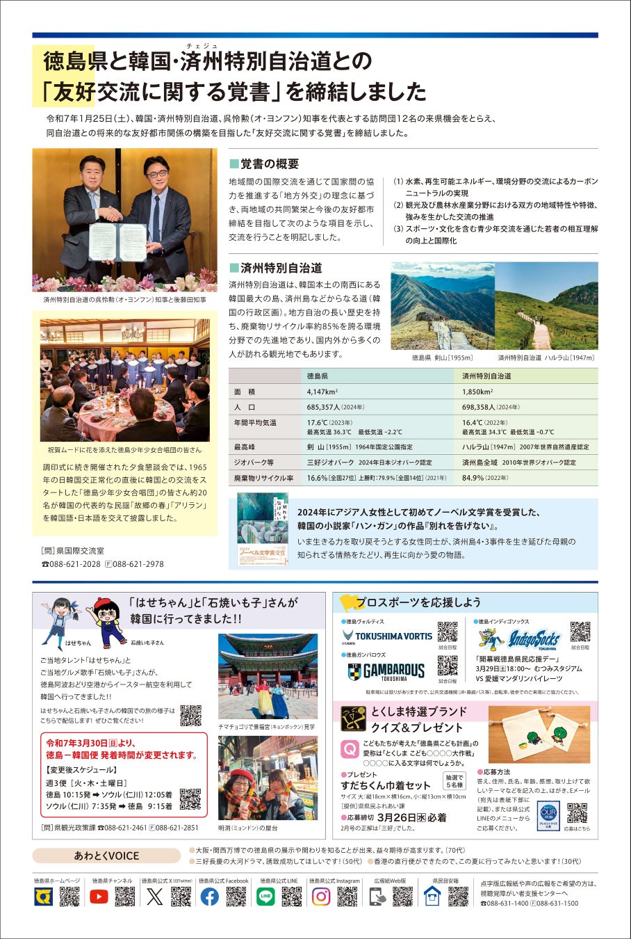 3月号では、「徳島県こども計画」や、「韓国・済州特別自治道との友好交流に関する覚書締結」などについて掲載しています。是非ご覧ください。