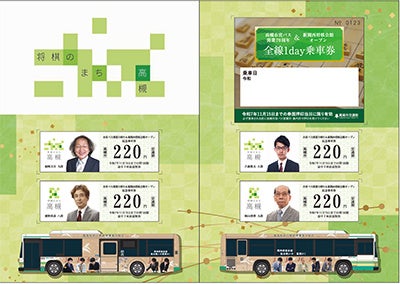 この記念乗車券は、大阪市福島区に所在する関西将棋会館が本市へ移転し、今年ついにオープンを迎えること、令和6年2月に市営バスが開業70周年を迎えたことを記念して製作されました。記念乗車券には、本市ゆかりの4人の棋士、福崎文吾九段、浦野真彦八段、古森悠太五段、桐山清澄九段がそれぞれ描かれた220円普通券4枚と市営バス全線が乗り放題となる「全線1day乗車券」1枚を、車内外が将棋一色にラッピングされたバス「高槻将棋ライナー」、将棋漫画「将棋の渡辺くん」などがデザインされたA4サイズの特製台紙にセットし、特製クリアファイル