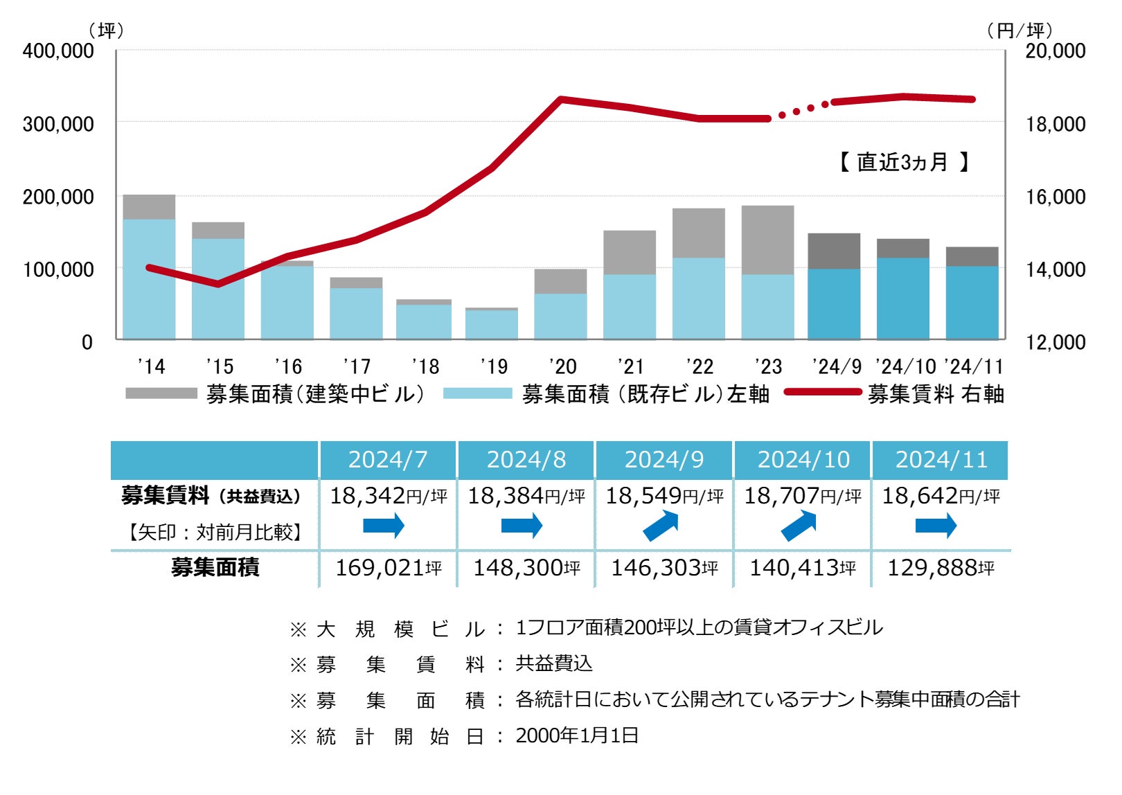 募集賃料は前月比マイナス65円/坪の18,642円/坪となった。4ヵ月ぶりで下落したものの小幅な動きに止まっており、18,000円/坪台後半で推移している。