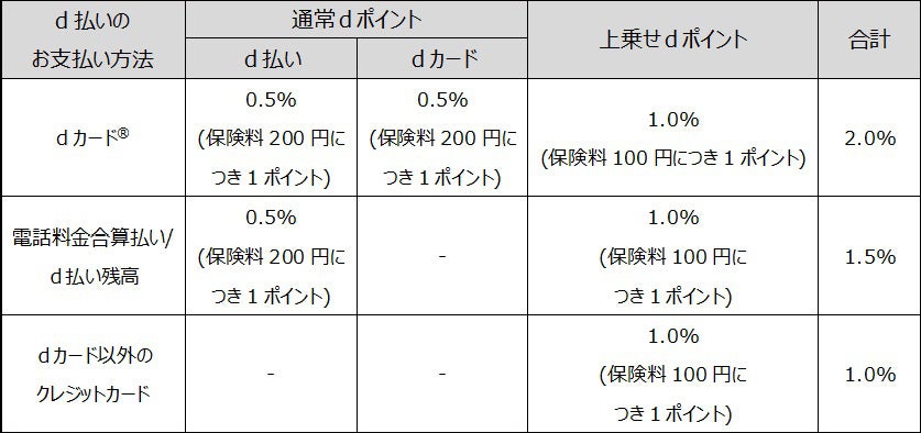 保険料(dポイント利用分を除く)に対して最大2.0%のdポイントがたまります。
