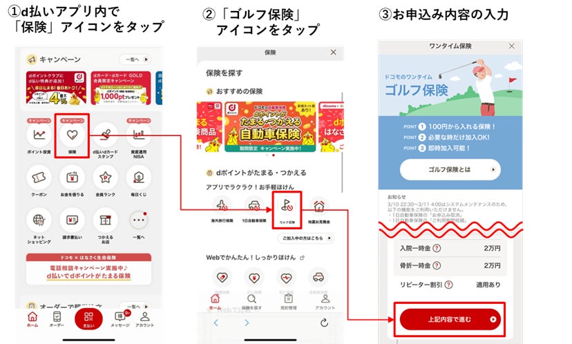「d払い」アプリ内の保険ポータルサイト、または外部ブラウザからお申込み可能です。
