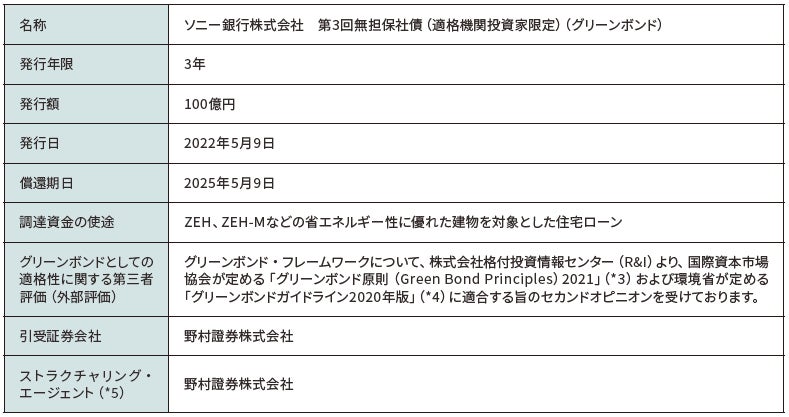 ソニー銀行株式会社(代表取締役社長:南 啓二/本社:東京都千代田区/以下 ソニー銀行)は、2022年5月9日にグリーンボンド(*1)(以下、本グリーンボンド)を発行しましたので、お知らせいたします。住宅ローンに充当するグリーンボンドの発行は国内銀行初となります(4月27日野村證券調べ)。