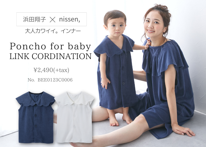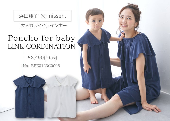 ママと赤ちゃんのリンクコーデ商品の新作「バスポンチョ」は、ボタンを外さないで頭からすぽっと着られるデザインなので、ワンオペお風呂で大活躍。また、薄手のタオル生地で軽くてかさばらないので、旅行やプールにもオススメです。