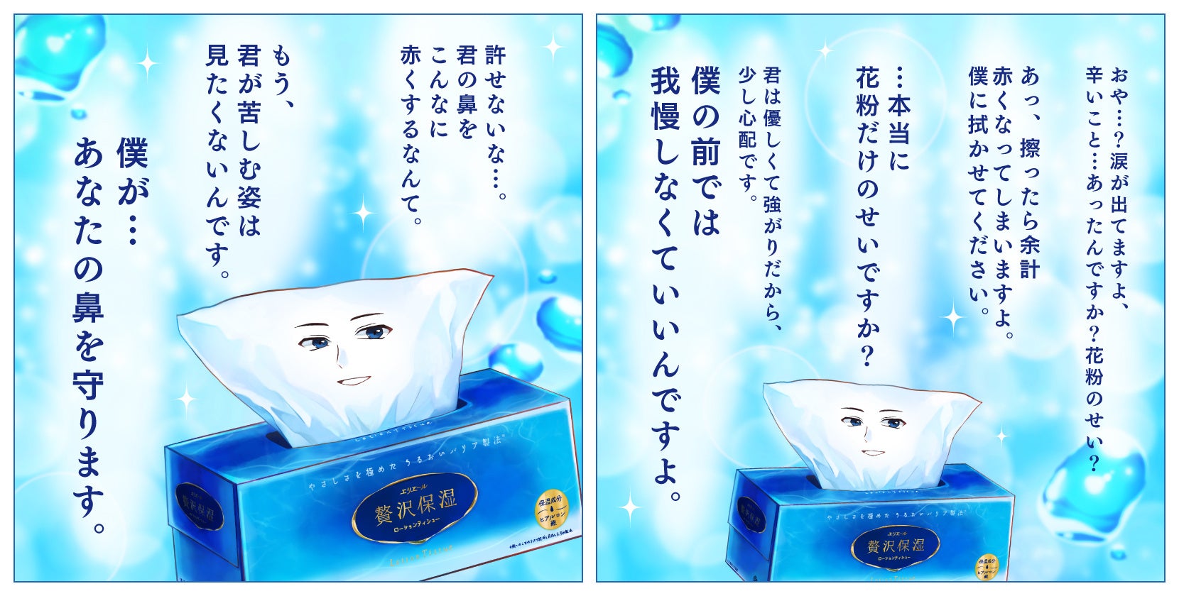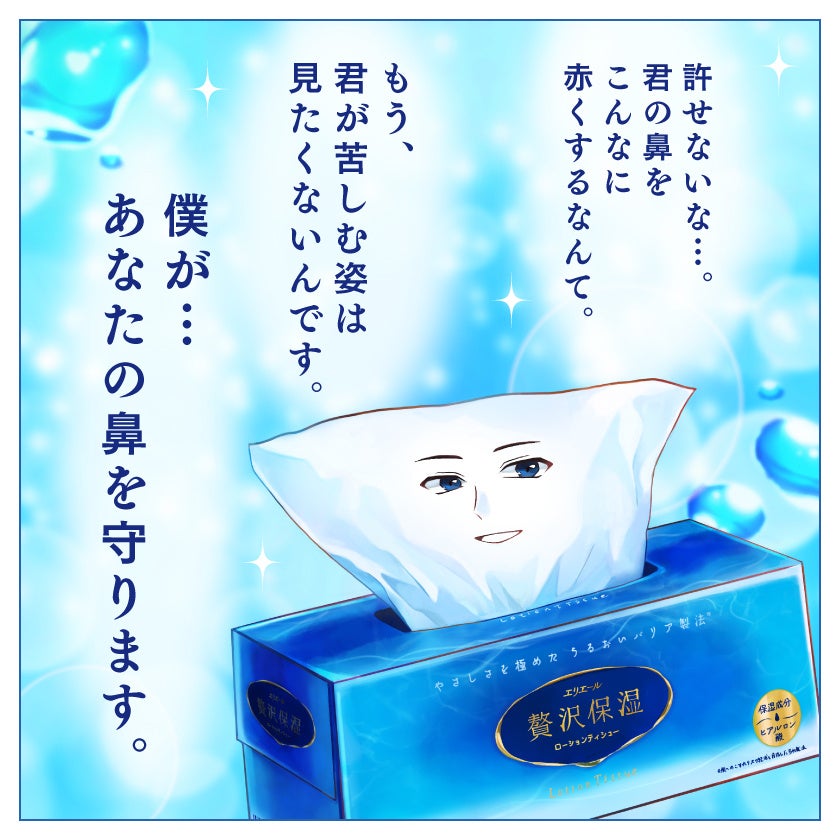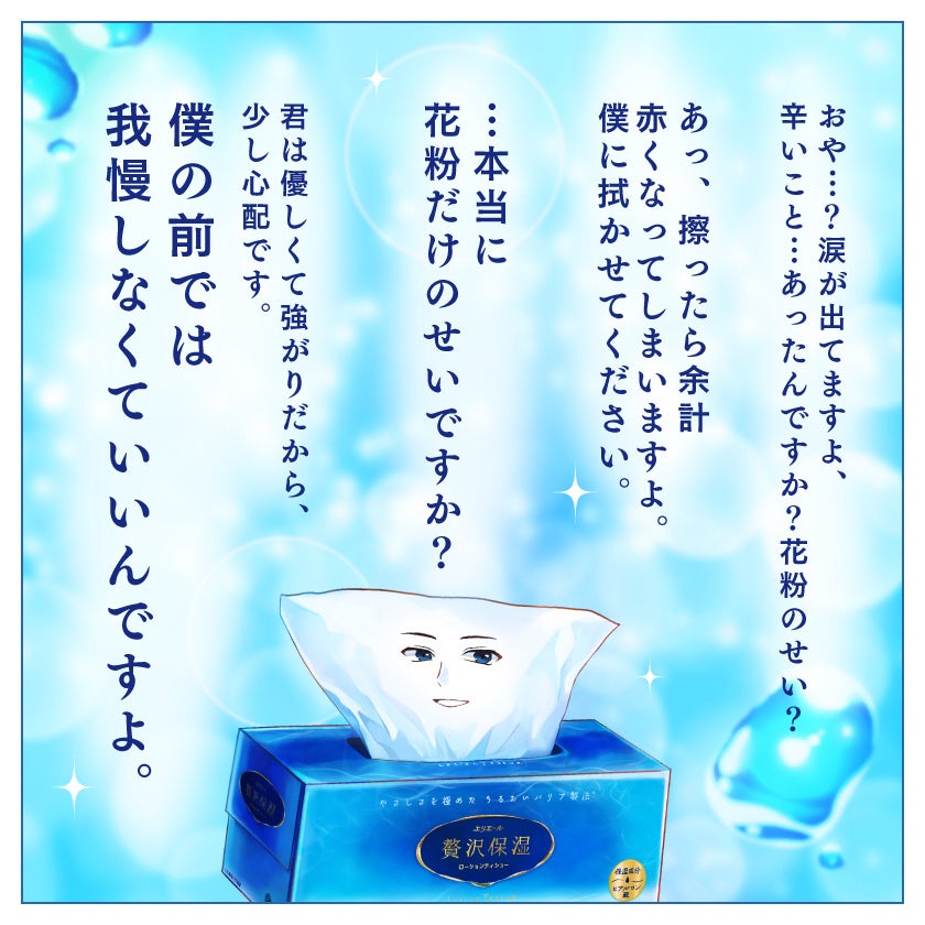 僕も普段から家で『贅沢保湿ティシュー』を使っているんですけど、ティシューの柔らかさとか質の違いというのを僕の声と共に楽しんで実感してもらえたらなと思っております。普段の生活のちょっとした贅沢としてティシューもやさしいものを使っていただけたらなと思っております。