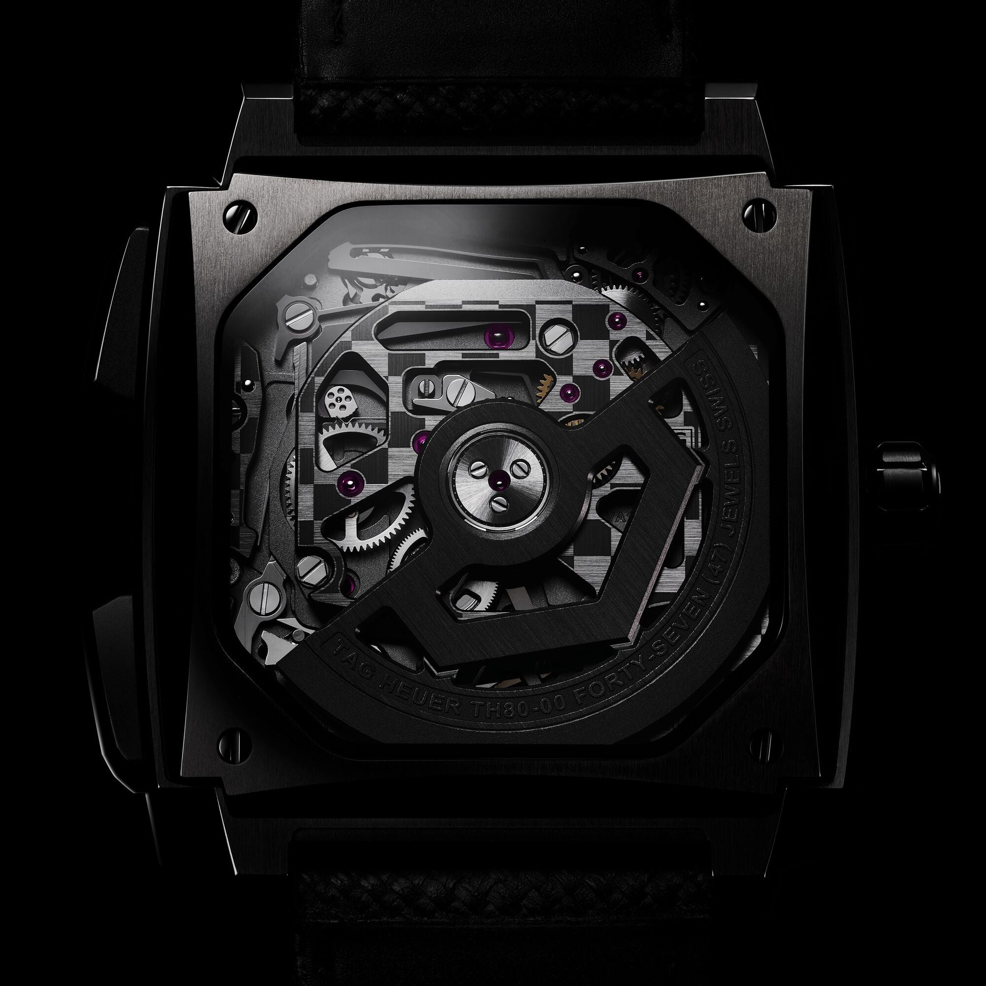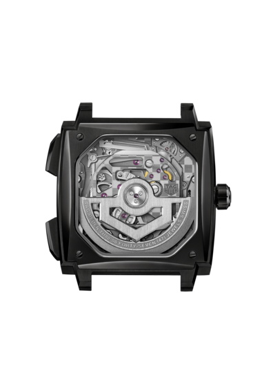 スプリットセコンド用のTH81-00で確立された設計思想を継承しつつ、シールド型ローターを採用。ムーブメントの背面にはタグ・ホイヤーのシグネチャーであるチェッカーフラッグ仕上げが施されています。