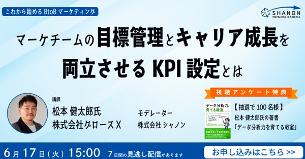株式会社シャノン(本社:東京都港区、代表取締役CEO:山﨑 浩史)は、6月17日(火) に「マーケチームの目標管理とキャリア成長を両立させるKPI設定」をご紹介するセミナーを開催いたします。