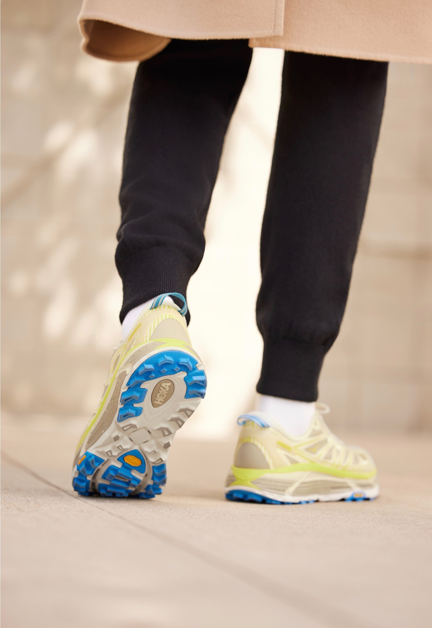 「ORIGIN STORY」では、HOKAのルーツである山をテーマに、トレイルランニングシューズ「MAFATE SPEED 2」を現代のライフスタイルにフィットするデザインにアップデートしています。ルーツであるトレイルで必要なパフォーマンスを発揮するテクノロジーはそのままに、HOKAらしいボリュームシルエットにネオンカラーとHOKAのブランドカラーであるブルーを配した、コーディネートのアクセントになるデザインです。