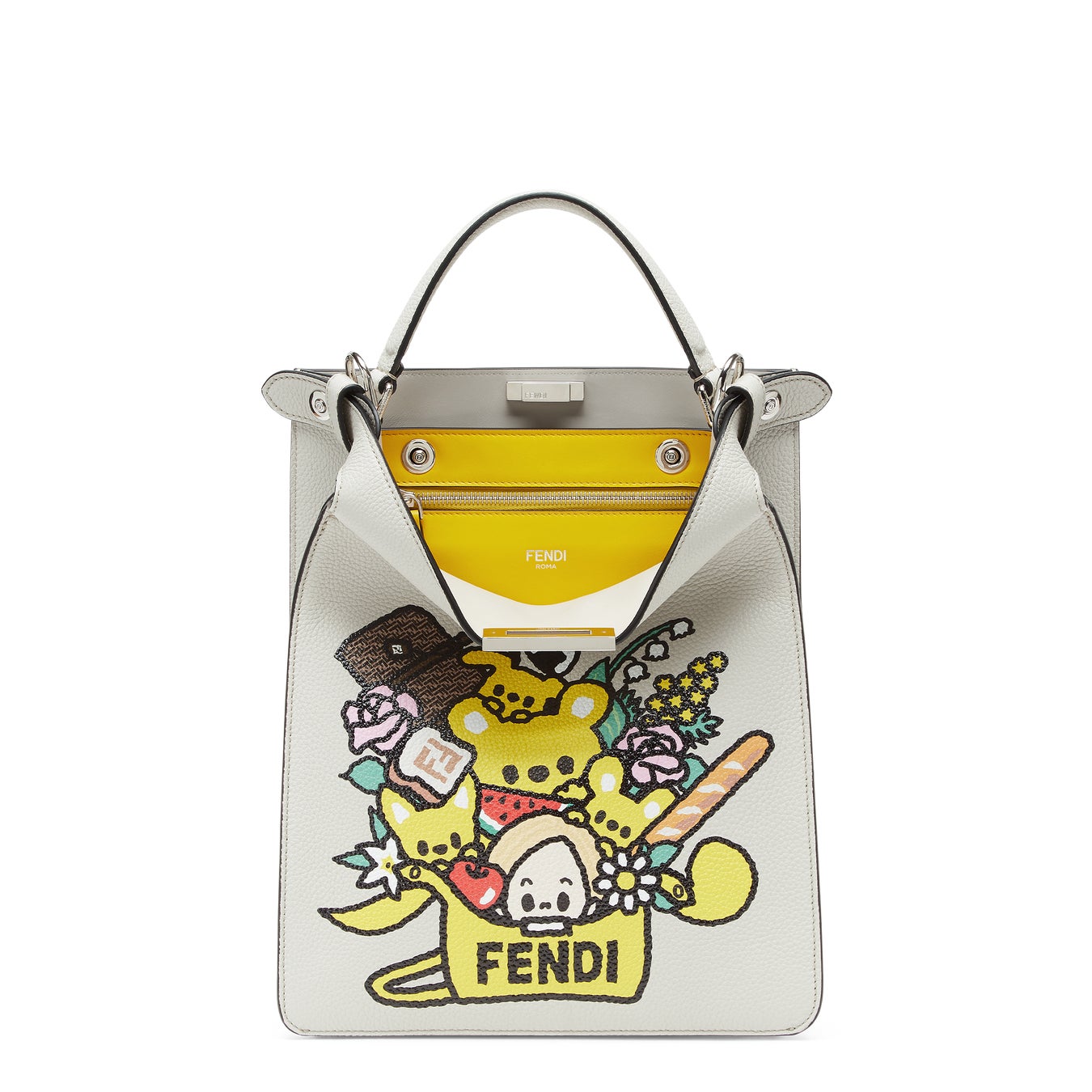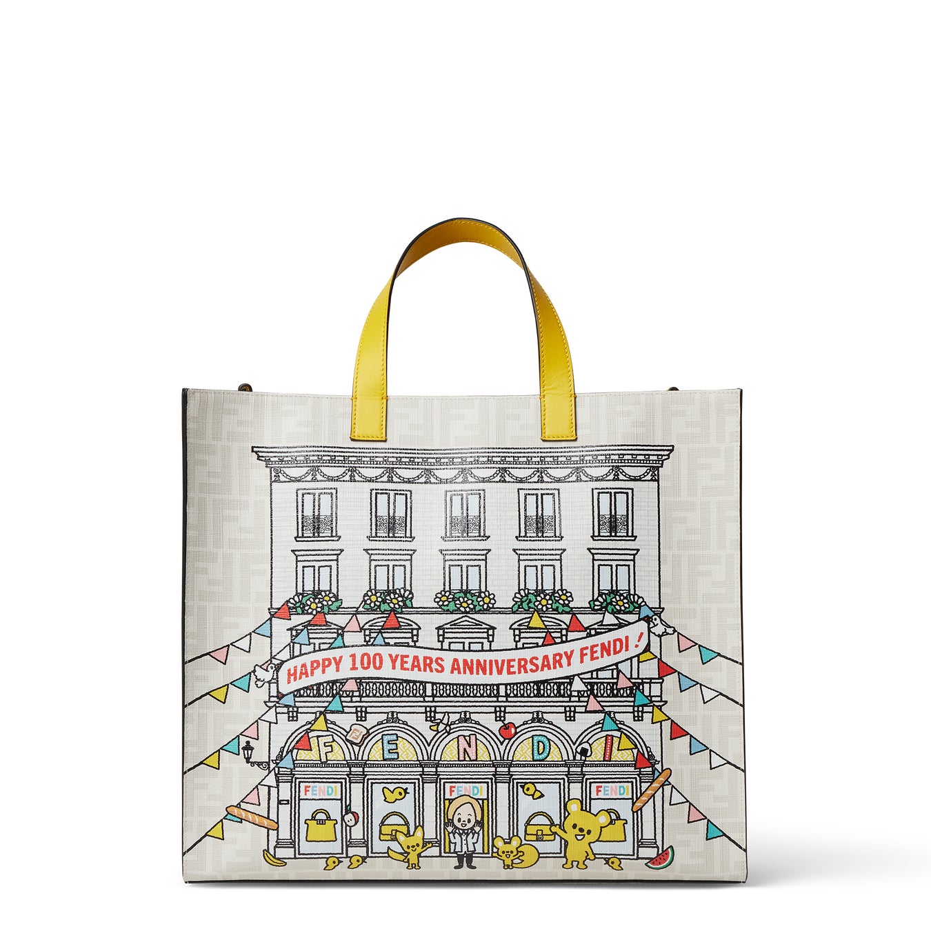 この度、フェンディの創業100周年を記念して、タロアウトが描く新たなイラストが誕生しました。ローマ本店 「パラッツォ フェンディ(Palazzo FENDI)」で過ごすシルヴィア・フェンディと彼女の祖父母でありメゾンの創業者であるアデーレ・カーサグランデ・フェンディ(Adele Casagrande Fendi)とエドアルド・フェンディ(Edoardo Fendi)、シルヴィアの娘でありジュエリー部門のアーティスティック ディレクターのデルフィナ・デレトレズ・フェンディ(Delfina Delettrez Fendi)、そしてその子ども たちの遊び心に富んだシーンなど、彼はそのユニークなスタイルで、フルーツからトースト、おにぎりなどの「フェンディ チャーム」やアイコニックな「ピーカブー(Peekaboo)」と「バゲット」バックに囲まれたフェンディ家のメンバーを描いています。