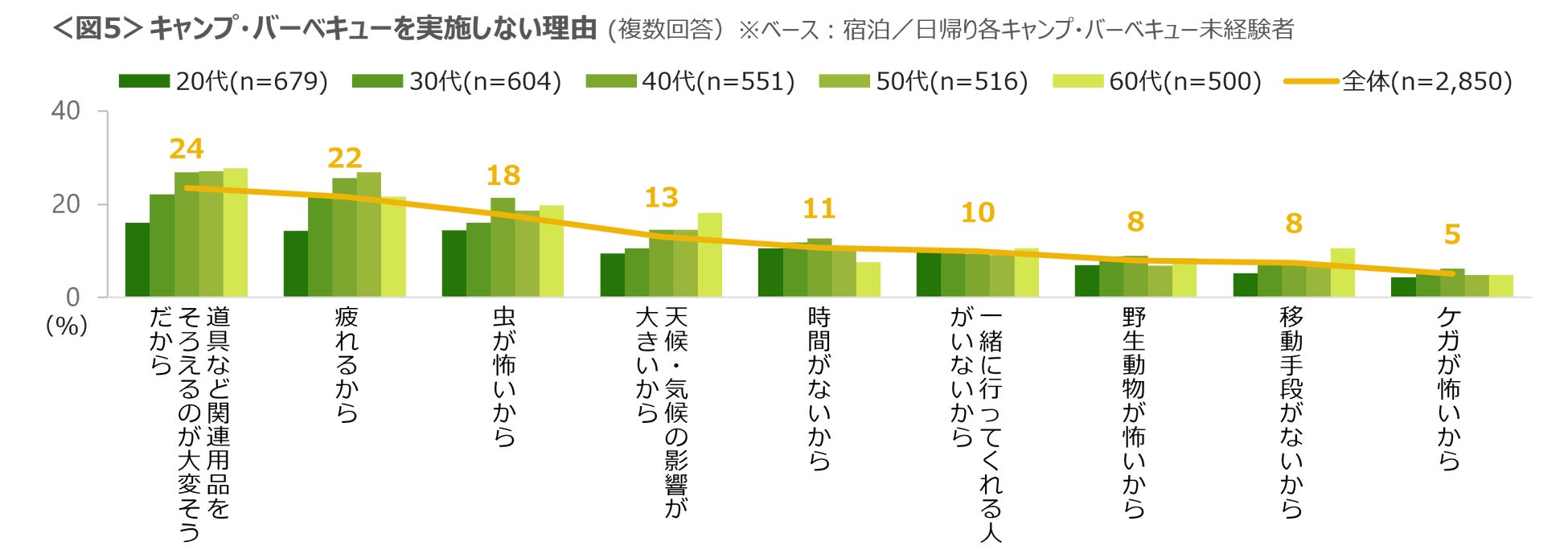 キャンプ・バーベキューの未経験の理由は、「道具など関連用品をそろえるのが大変」「疲れる」「虫が怖い」など。<図5>