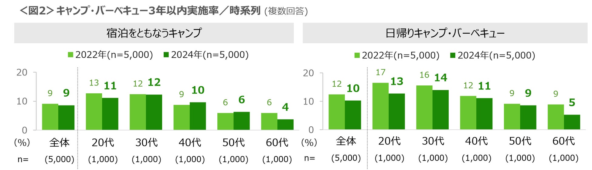 宿泊をともなうキャンプの実施率は9%、日帰りのキャンプ・バーベキューの実施率は10%であり、いずれも20~40代の実施率が高い。日帰りのキャンプ・バーベキューの実施率は、コロナ禍の2022年より、どの年代でもやや低下していた。<図2>