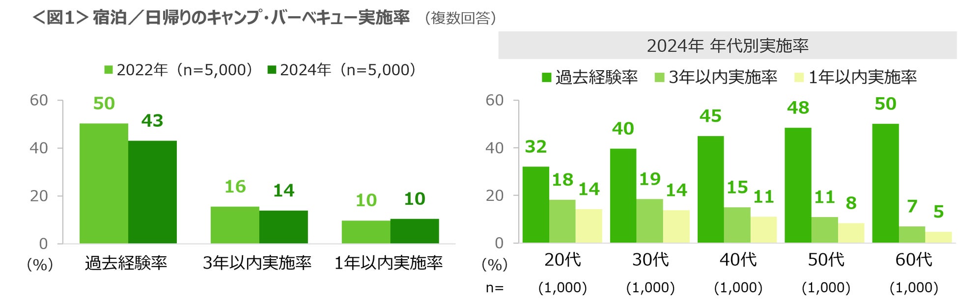 宿泊をともなう/日帰りのキャンプ・バーベキュー実施経験者は43%、直近3年以内は14%、1年以内は10%であり、2年前と比べ大きな変わりはない。直近3年以内、1年以内の実施率は20~30代で高い。<図1>