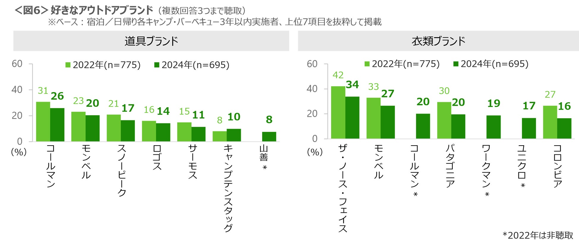 好きなアウトドアブランドを3つまで聴取した結果、道具は「コールマン」「モンベル」「スノーピーク」、衣類では「ザ・ノース・フェイス」「モンベル」「コールマン」「パタゴニア」が上位にあがった。<図6>