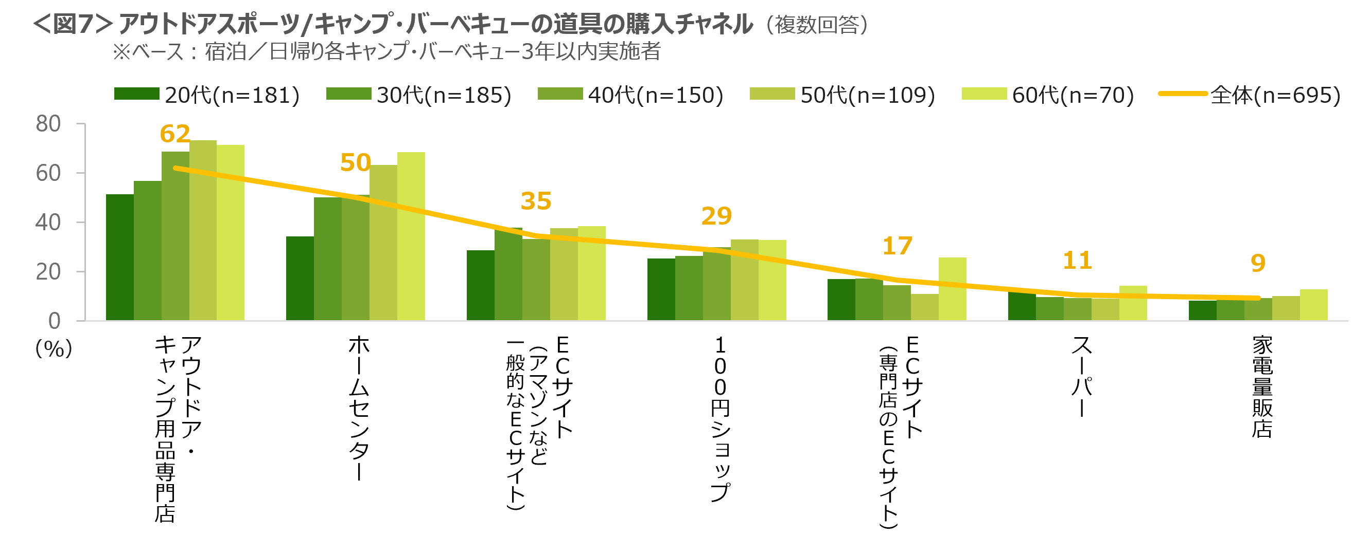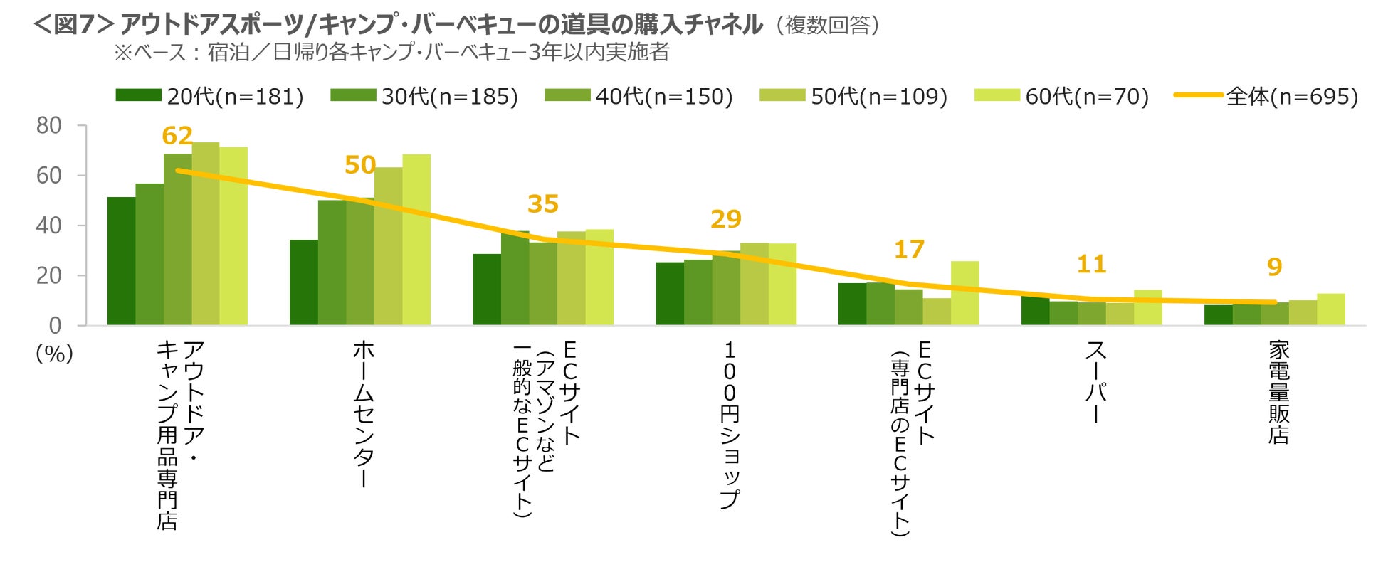 アウトドアスポーツ・キャンプ・バーベキューなどの道具の購入先は「アウトドア・キャンプ用品専門店」が62%、「ホームセンター」50%、「アマゾンなど一般的なECサイト」35%。「専門店」「ホームセンター」は50~60代の利用が目立った。<図7>