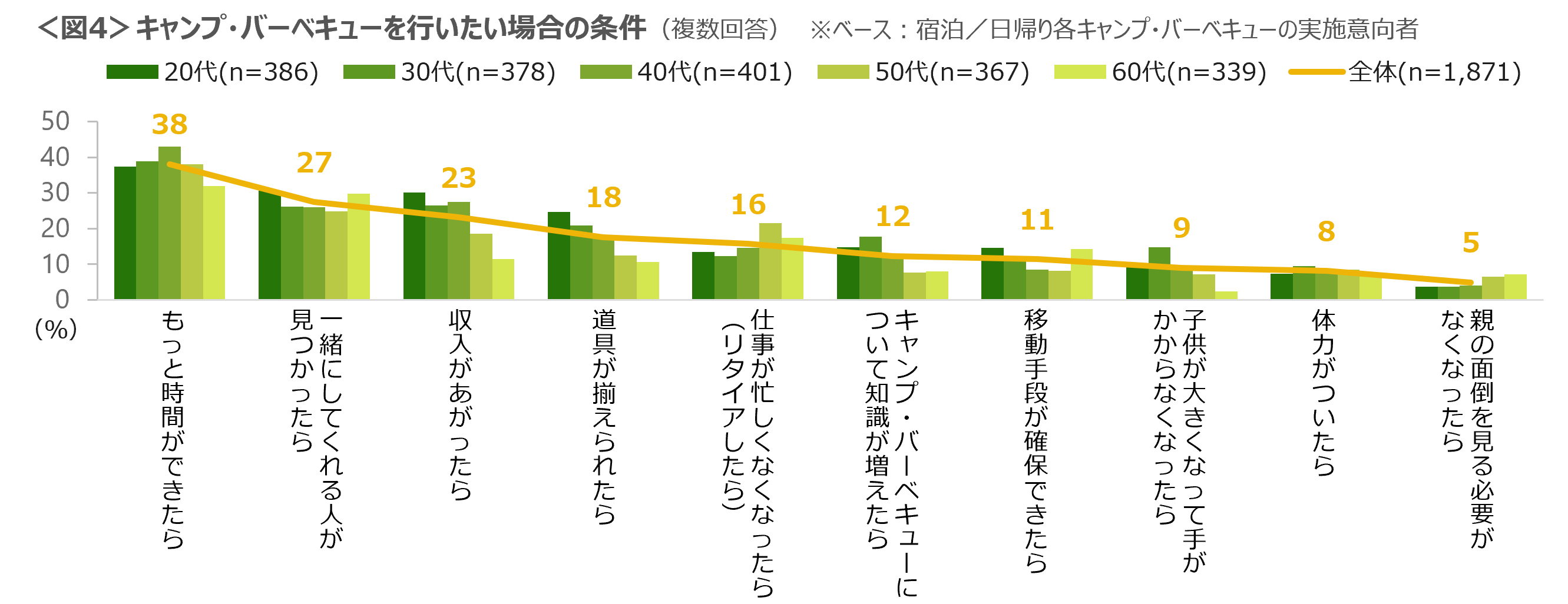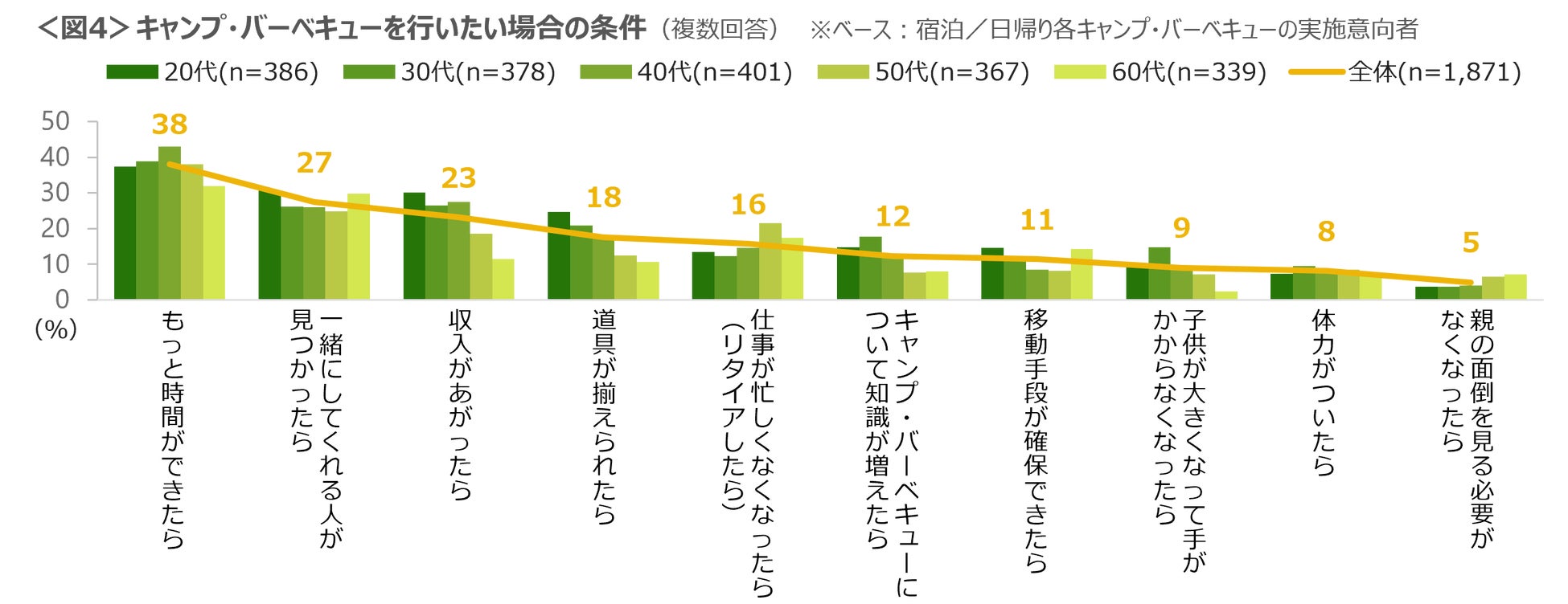 今後のキャンプ・バーベキューの意向者に対し、行う場合の条件を確認した。「もっと時間ができたら」「一緒にしてくれる人が見つかったら」「収入があがったら」が上位であり、「収入があがったら」「道具が揃えられたら」という金銭面にかかわる割合は20~40代で高い。<図4>