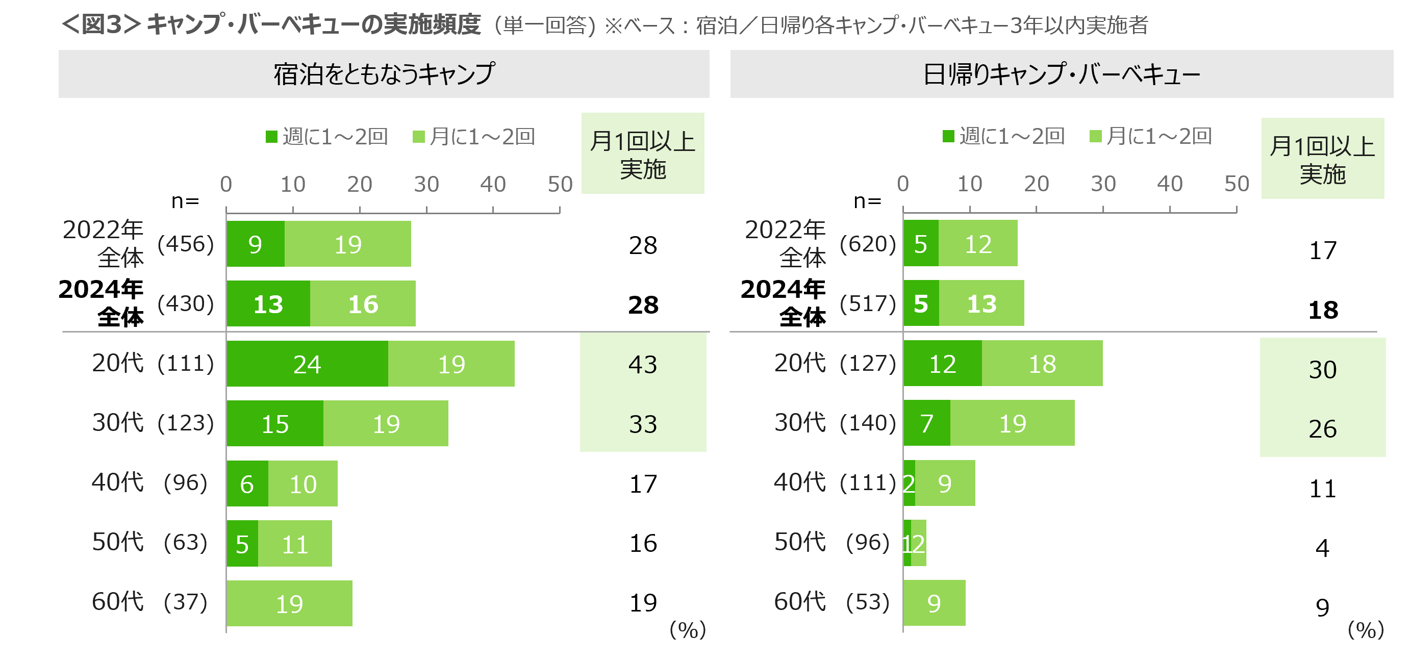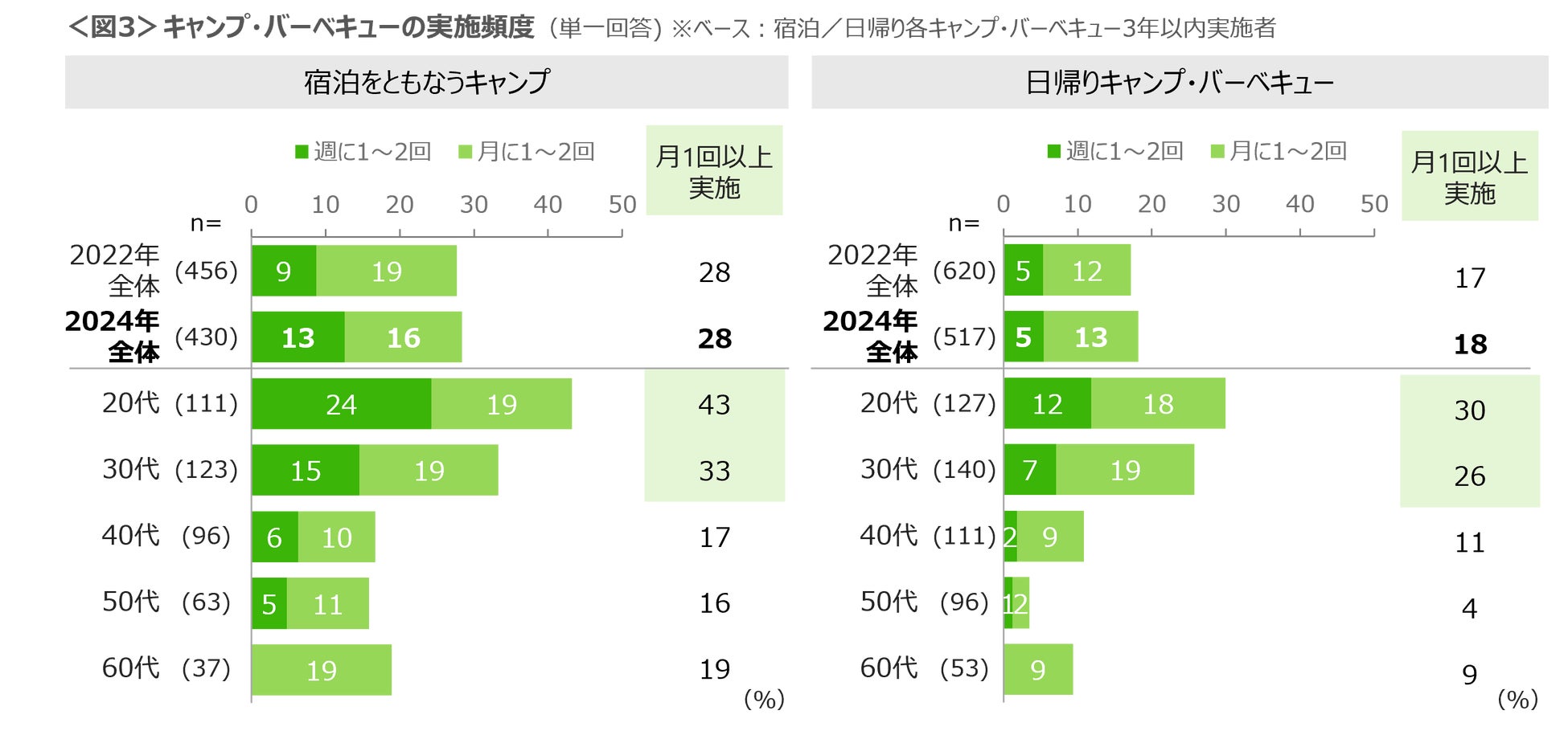 キャンプ・バーベキューを月に1回以上実施している割合は、宿泊をともなうキャンプで28%、日帰りキャンプ・バーベキューは18%と、宿泊をともなうキャンプの方が多い。宿泊/日帰りともに20~30代の実施頻度は特に高い。<図3>