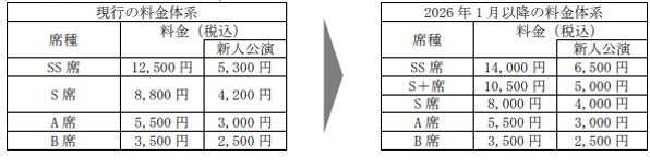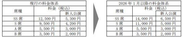 宝塚歌劇公演におきましては、物価上昇等の影響により、公演制作にかかわる各種資材の調達コストや劇場の運営・維持更新コストが以前に比して大幅に増加しております。当社といたしましては、2009年以降、消費税率の変更に際して座席料金を一部改定したものの、長年にわたり、座席料金を据え置くべくさまざまな努力工夫を重ねてまいりました。しかしながら、近年急激な物価高騰が続く中、現行の座席料金を維持することは非常に困難な状況となっており、引き続き宝塚歌劇として華やかでオリジナリティのある作品をお届けできるよう、2026年1月より座席料金の一部改定をお願いすることとなりました。