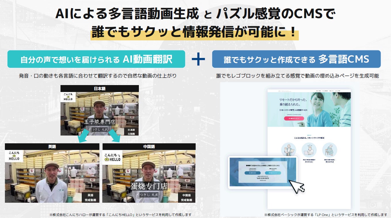 これらの課題を解決するために、『ベーシック』と『こんにちハロー』は共同でサービスを提供開始します。『ベーシック』の誰でもサクッと作成できる多言語CMSと『こんにちハロー』の自分の声で想いを届けられるAI動画翻訳の組み合わせにより、多言語によるホームページや動画コンテンツの提供を簡単に実現できるようになります。外国人観光客や顧客に対して、多言語で自社のサービスや商品を効果的にアピールすることが可能になることで、課題が解消され、事業者がそれぞれの強みを発揮し、固有の価値を生むための仕事に専念できる世界の実現を目指してまいります。